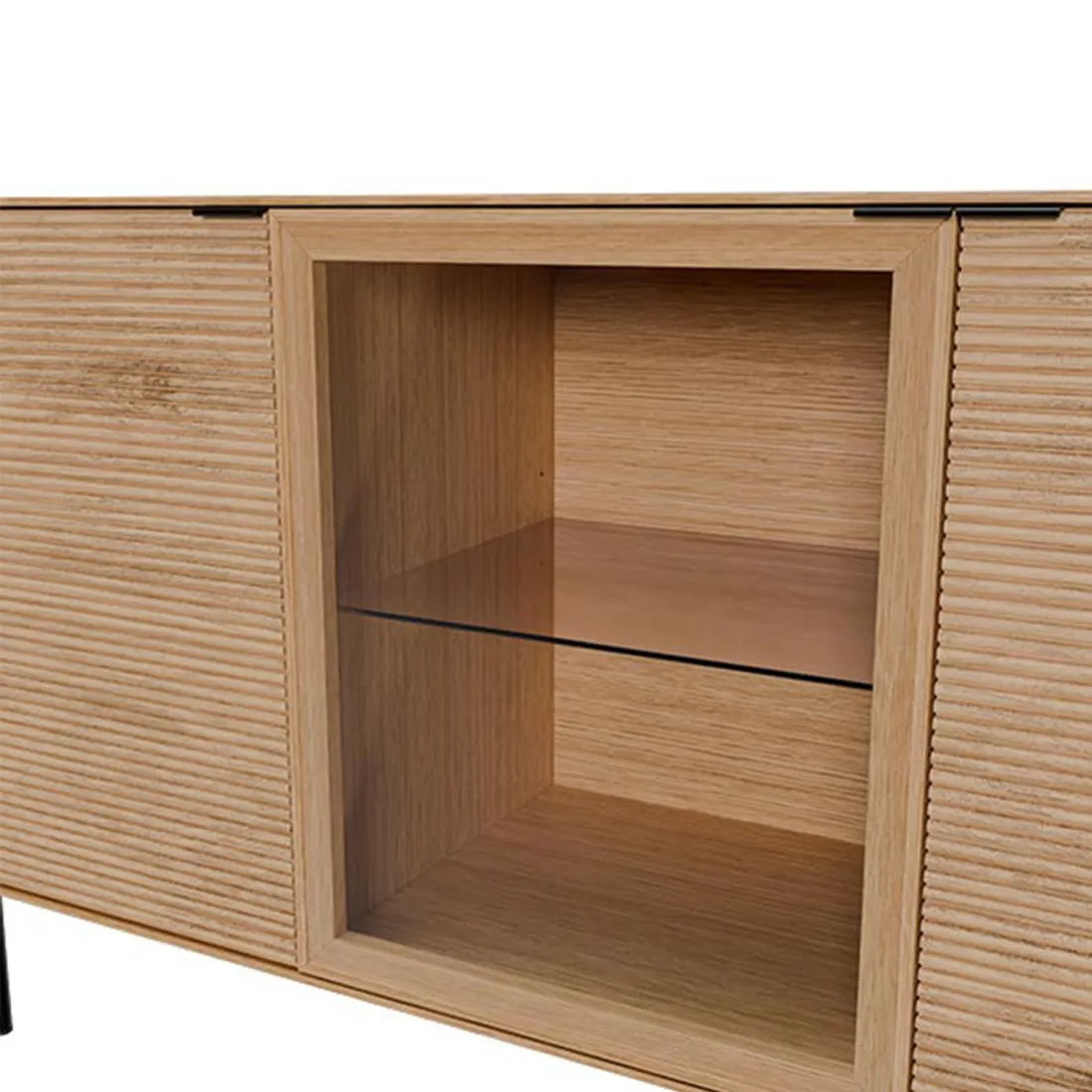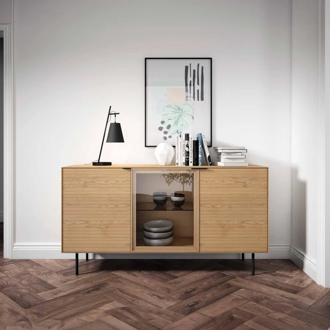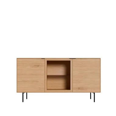 El aparador TULSA con 2 puertas de madera y 1 puerta de cristal combina funcionalidad y diseño con un equilibrio perfecto entre lo natural y lo sofisticado. Su estructura en chapa de roble y los frentes en madera maciza de roble rayado aportan textura, calidez y una presencia elegante.