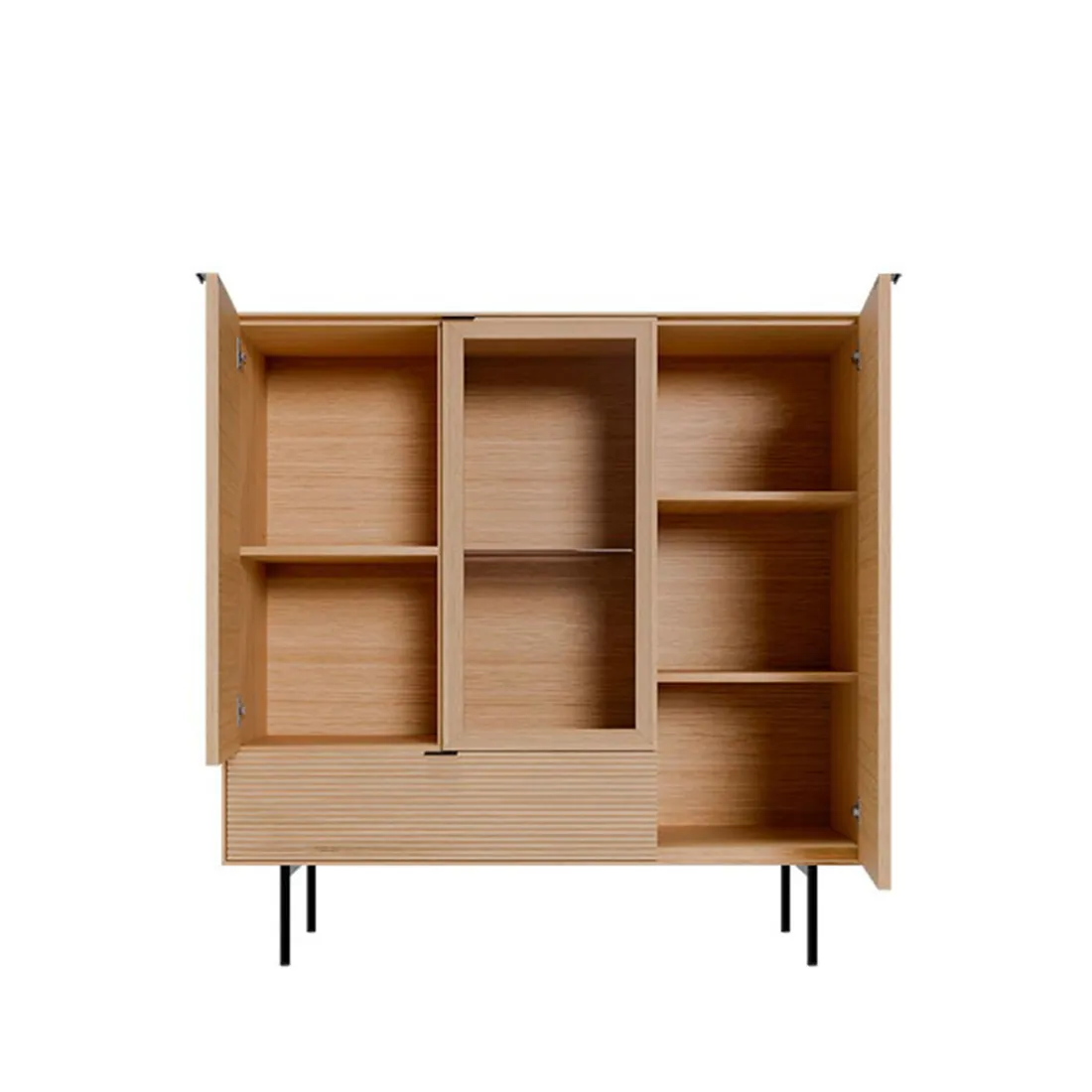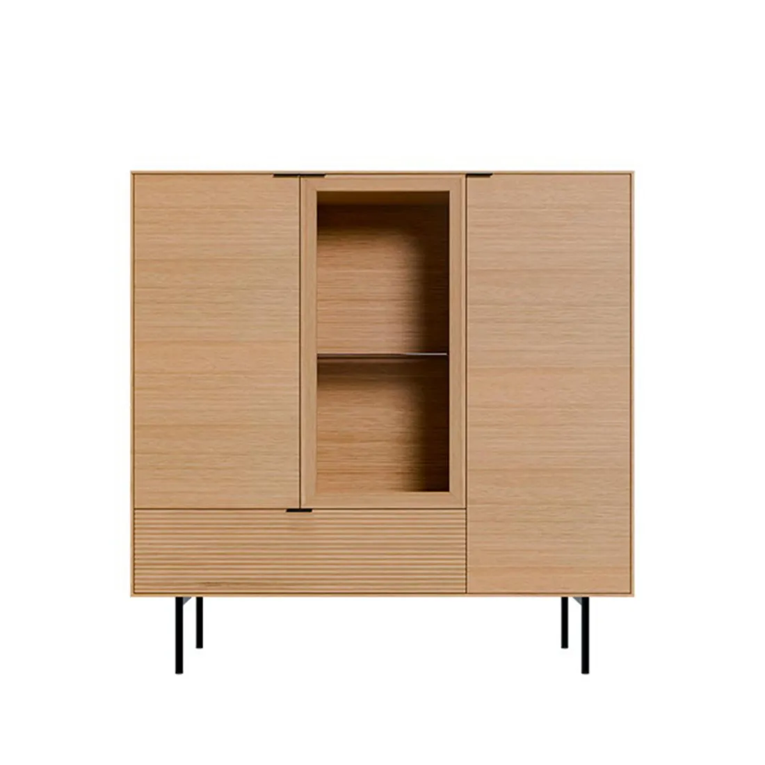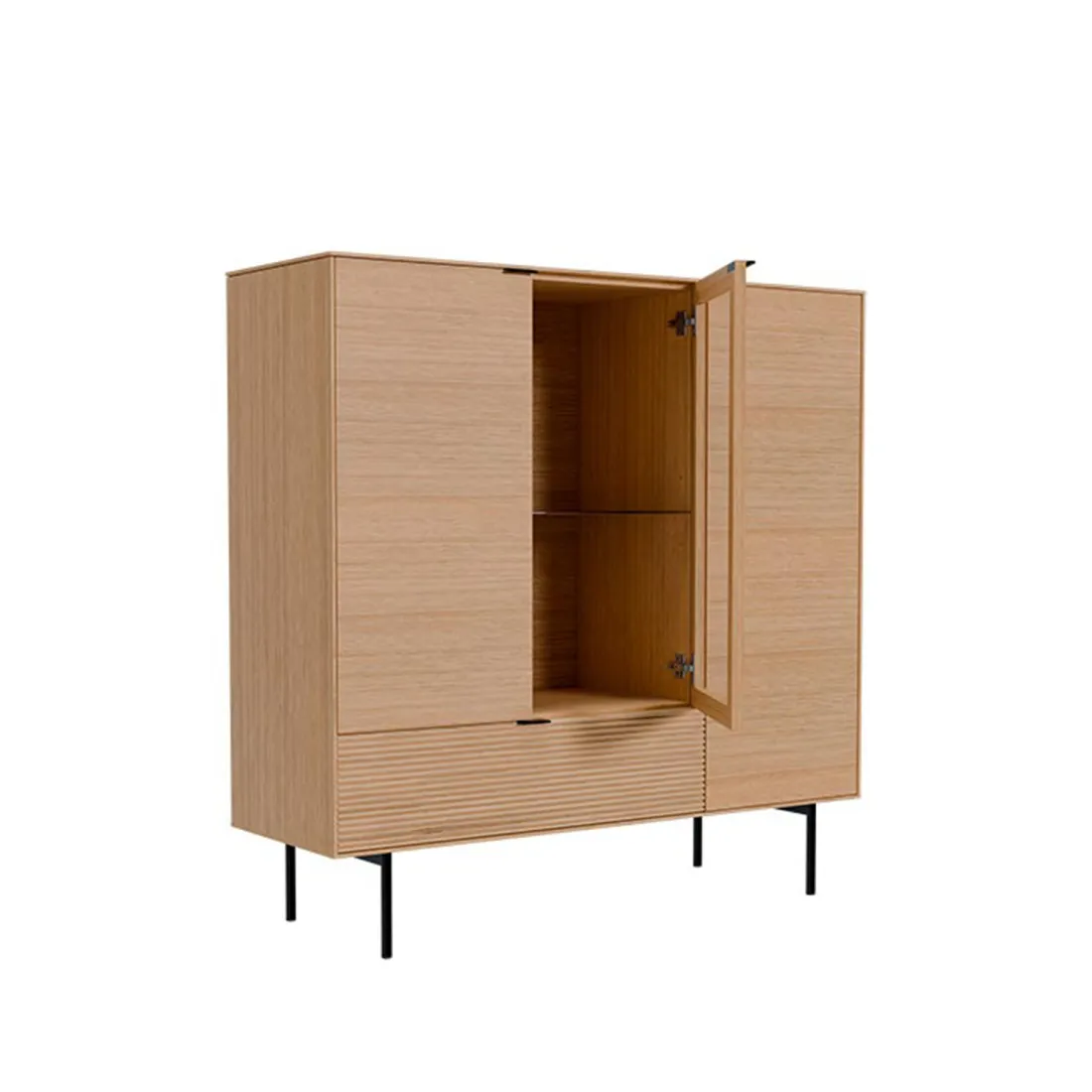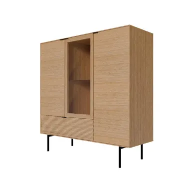 Con dos puertas de chapa de roble, una puerta abatible de cristal y un cajón, ofrece una distribución funcional que permite tanto almacenar como exhibir con elegancia. El sistema soft closing y las guías metálicas ocultas aportan confort y durabilidad.