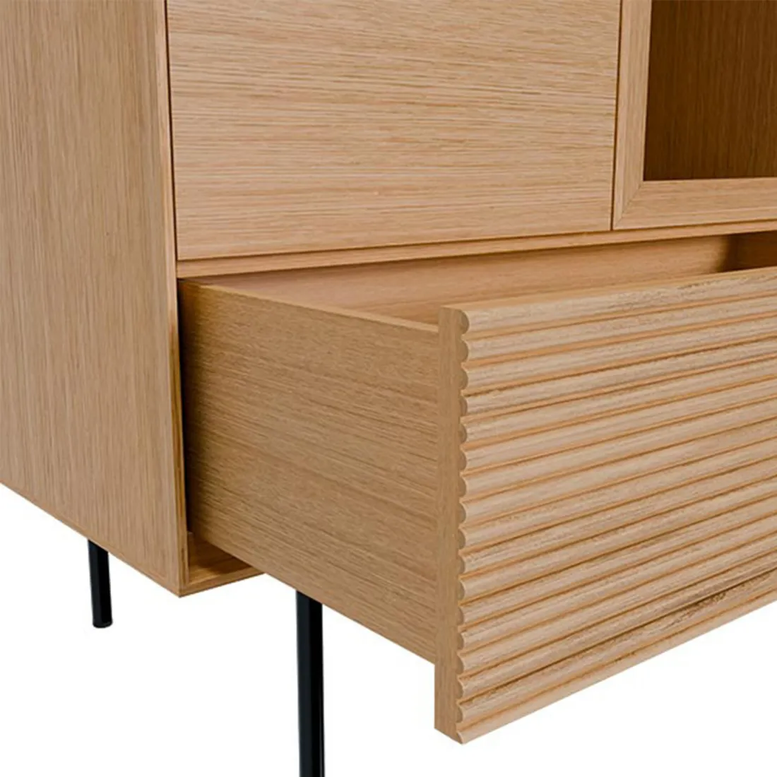 Aparador 4 puertas + 2 cajonesEstructura DM lacado blanco, frentes en chapa de roble natural con raya fresada lacada blanco.Guías metálicas ocultasApertura puertas/cajones sistema PUSHPata metálica lacada negro