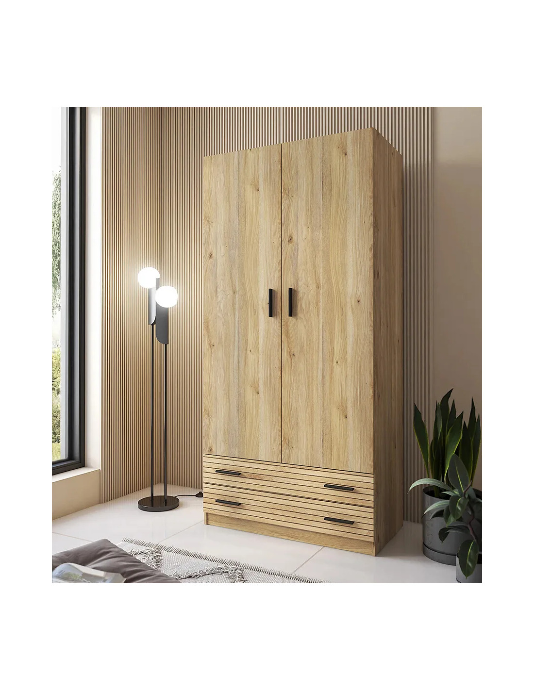 Armario de dos puertas y dos cajones modelo Rapid en acabado Roble Mauvella combinado con Rayas de diseño actual para darle un toque cálido a tu habitación.