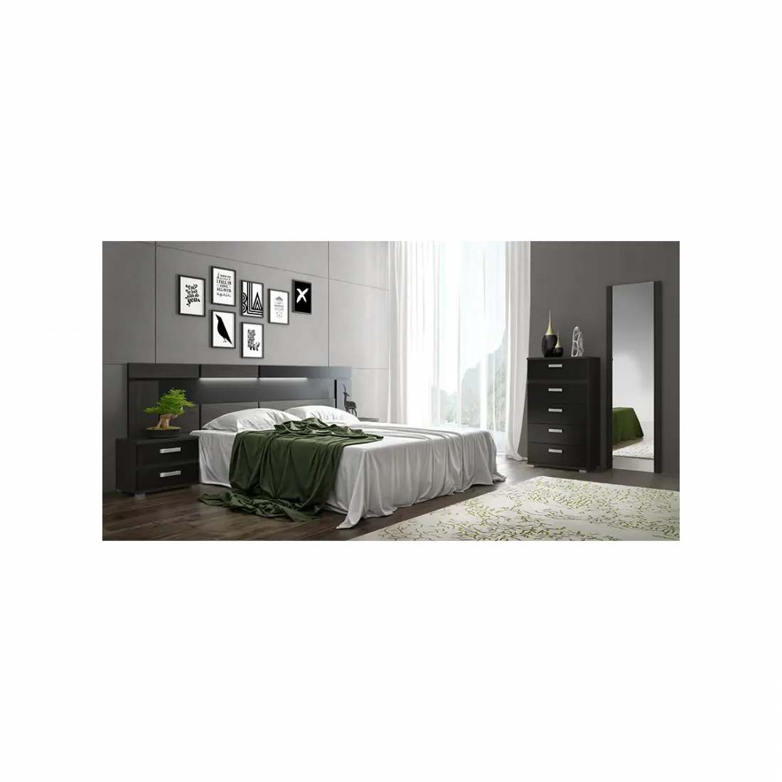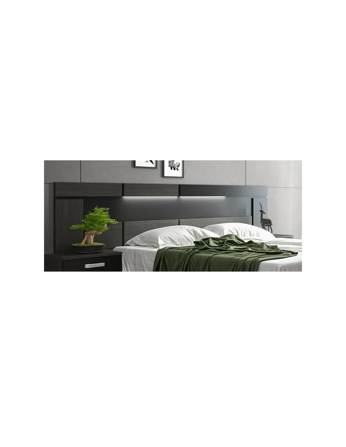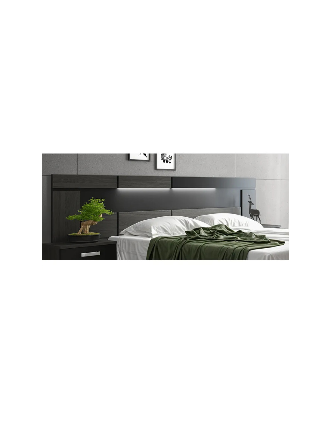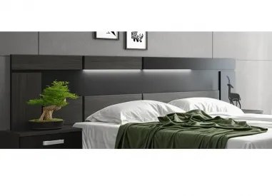 Elegante cabecero galería con luces led incluidas de la serie Rambla en ceniza combinado con negro, acabado elegante y versátil para tu dormitorio.