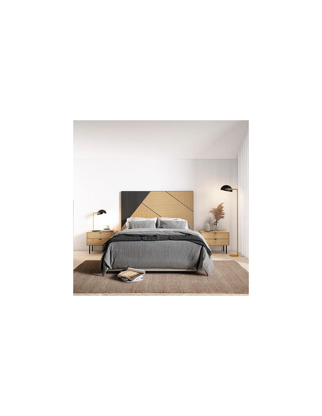 El cabezal NERI de 150 cm combina la calidez del roble natural con el carácter del negro lacado en un diseño de líneas fresadas que aportan textura y sofisticación. Ideal para dormitorios modernos con personalidad.