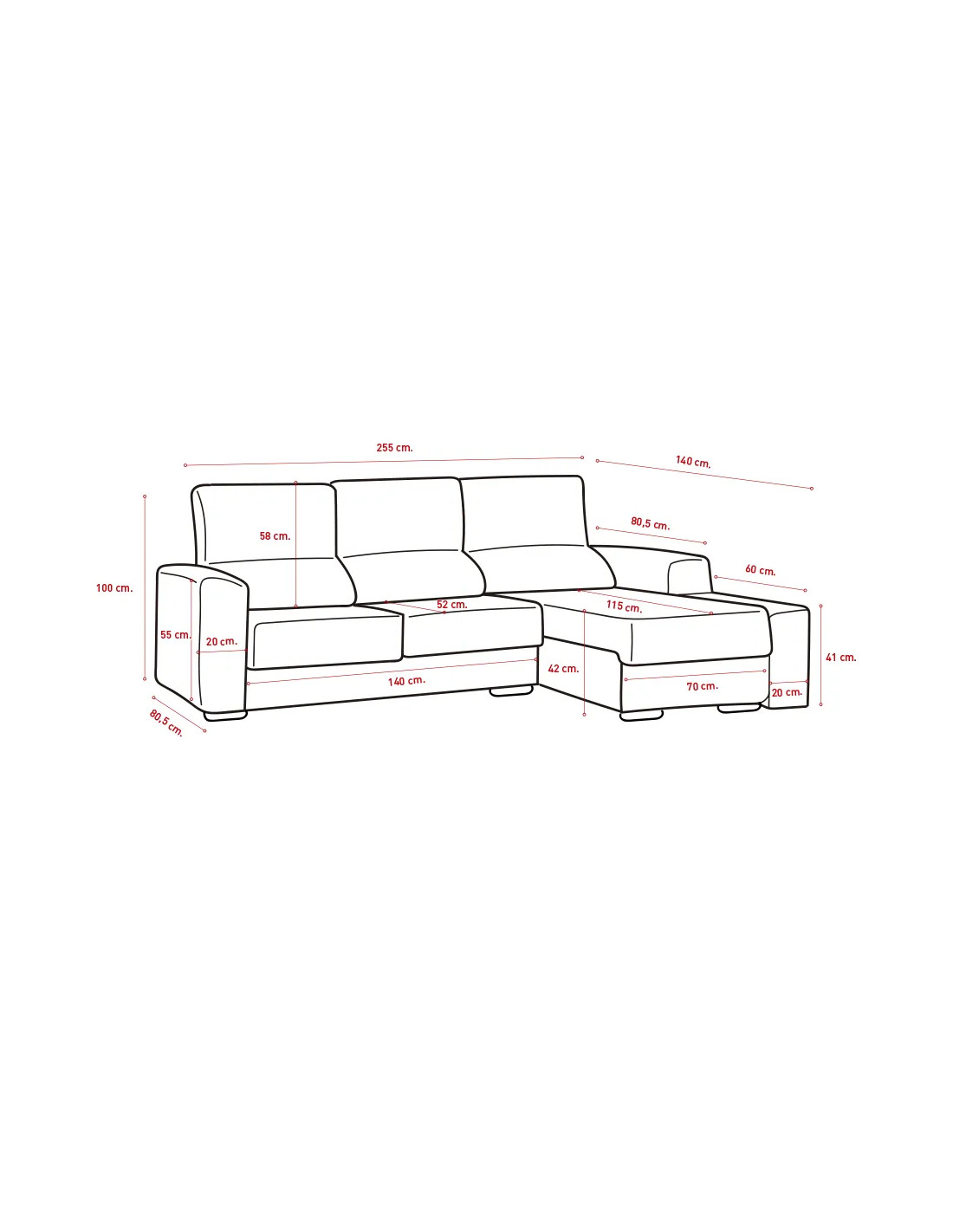 - Brazo largo recto de 20 cm ancho x 55 cm altura x 80,5 cm fondo con pouf (20x60 cm) delante del brazo.