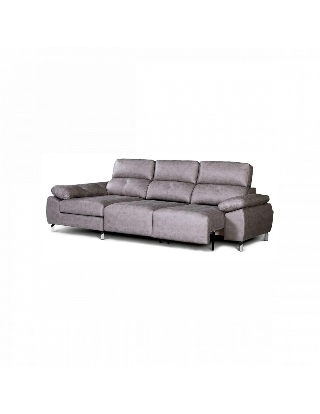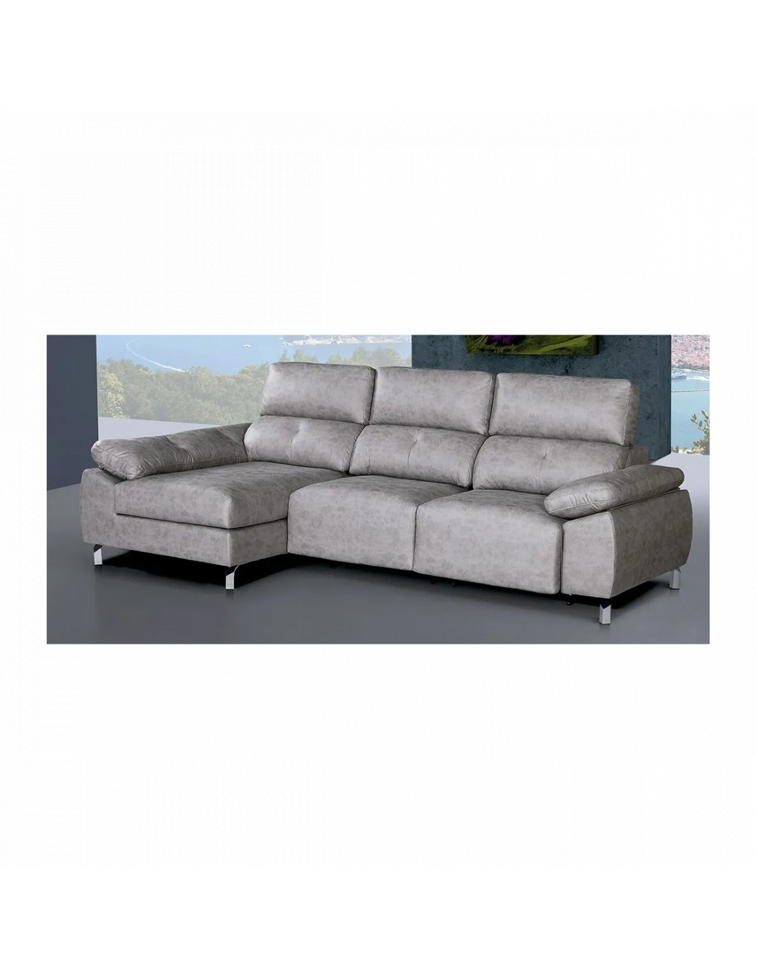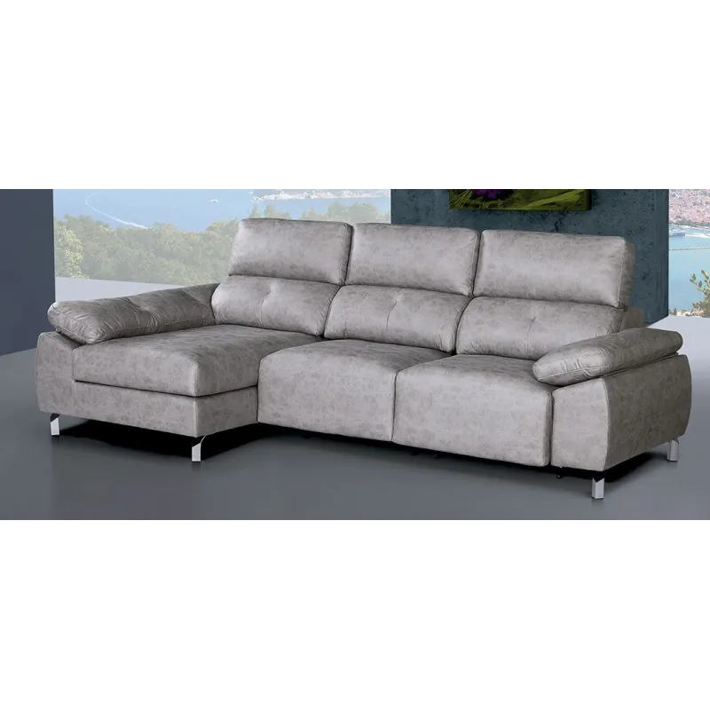 Sofá Chaise Longue con armazón de pino, asientos extraíbles, respaldo reclinable, muelle zigzag y patas cromadas ajustables. Tapizados en varios colores.