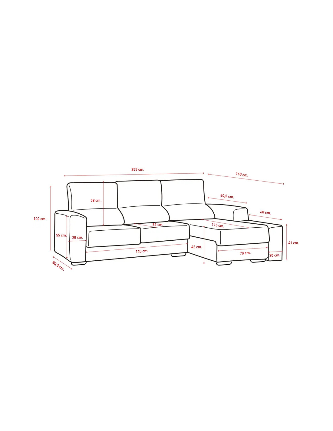 - Brazo largo recto de 20 cm ancho x 55 cm altura x 140 cm fondo
