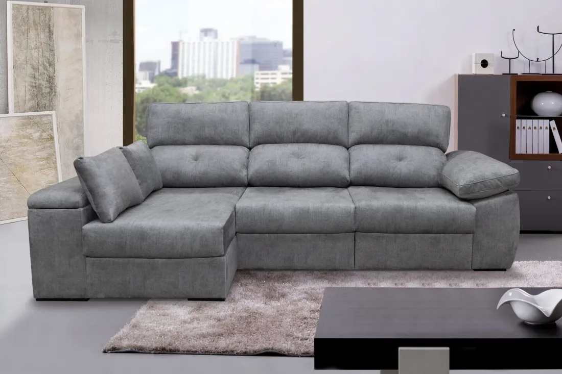 La chaiselongue Gredos es un modelo de 280cm exclusivo y comodísimo. Incluye los respaldos reclinables, los asientos de muelles ensacados deslizantes de carro con apoyo en el suelo y dos arcones. Disponible en diferentes tapizados y colores. También podrá encontrar el modelo 3 plazas 3 asientos en la web.