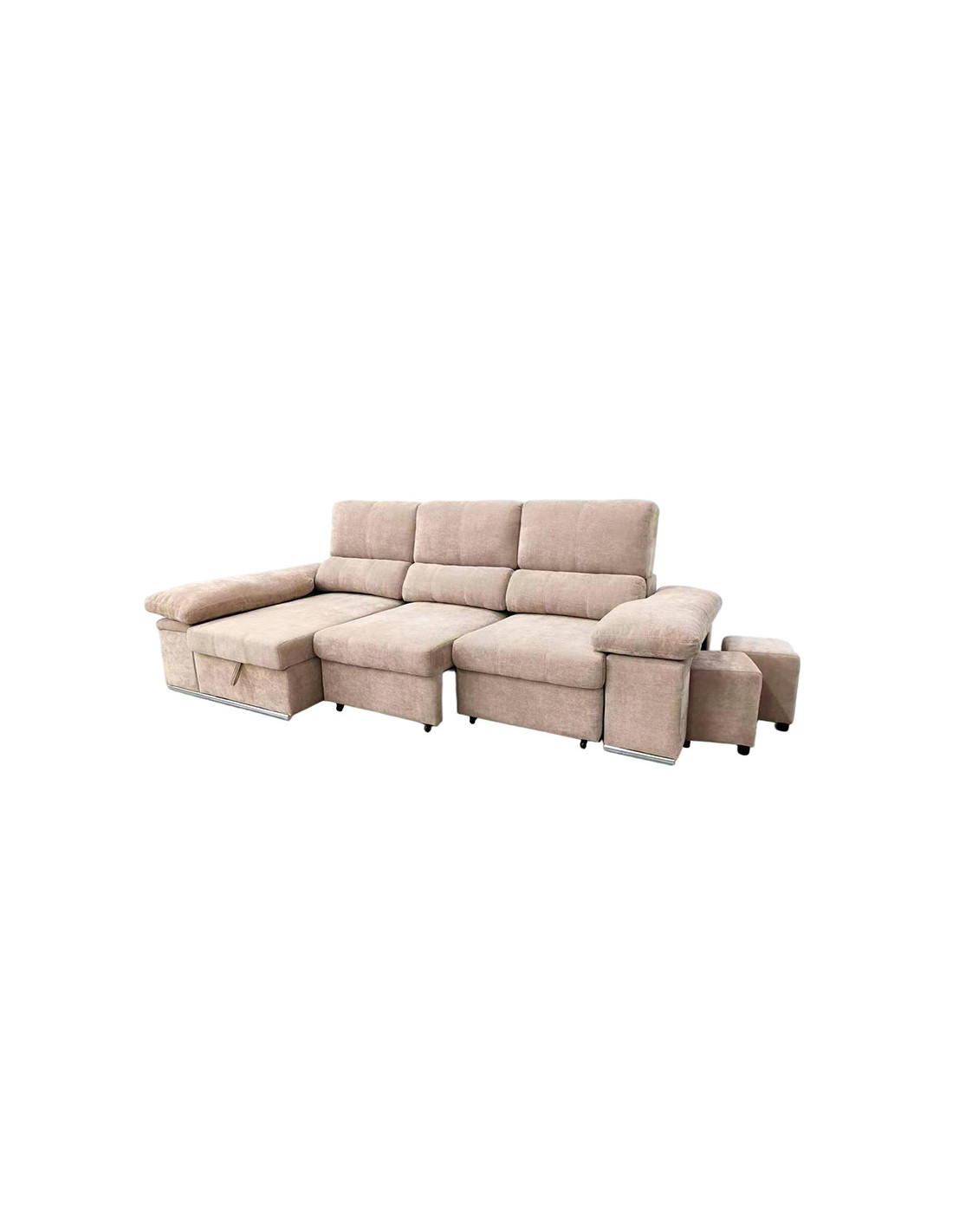 Shaiselongue cama Nadia, funcional y elegante, ideal para tu salón. Convertible en cama, con dos arcones (en asiento y brazo), incorpora dos prácticos taburetes tapizados. Su estructura de madera y asientos con muelle y espuma garantizan comodidad. Tapizado en tela RM24604, disponible en color beig y gris.