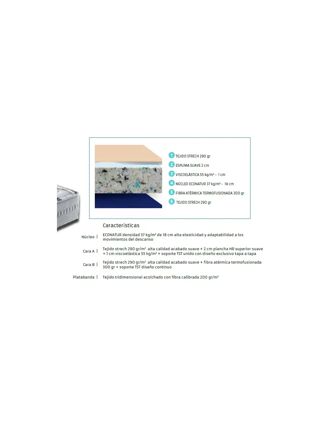 ACOLCHADO TEJIDO SUPERIOR: Tejido strech 290 gr alta calidad acabado suave HR 2 cm súper suave + visco 5 mm + soporte TST unido en confección continua.