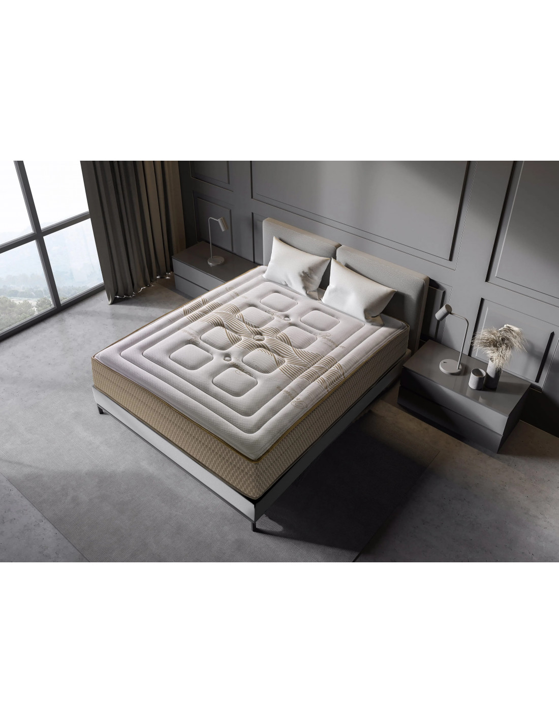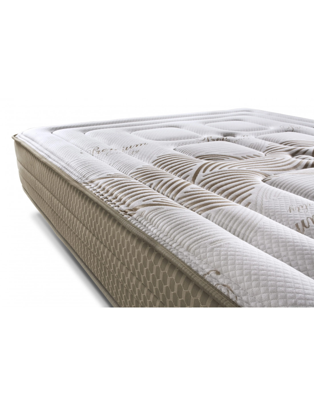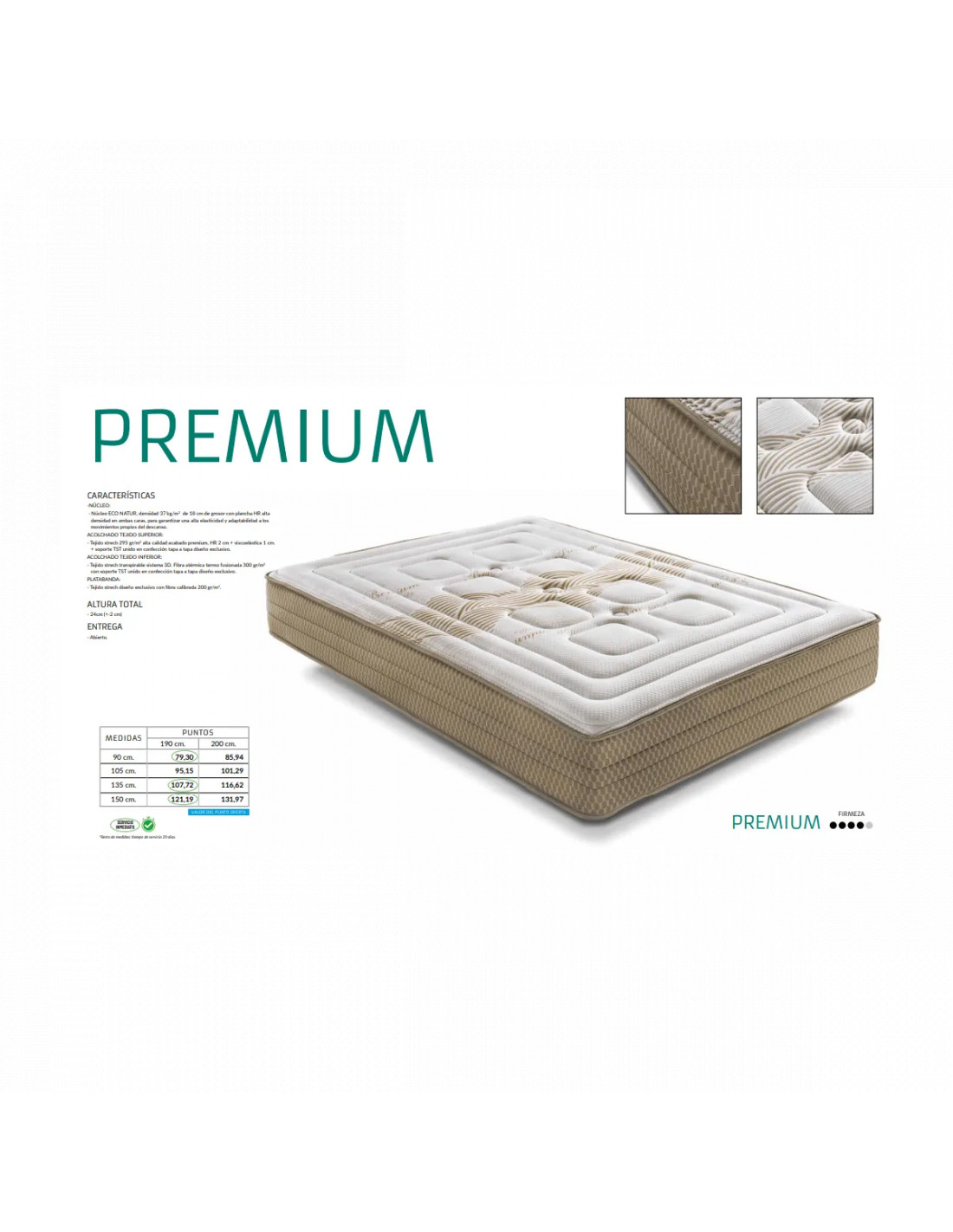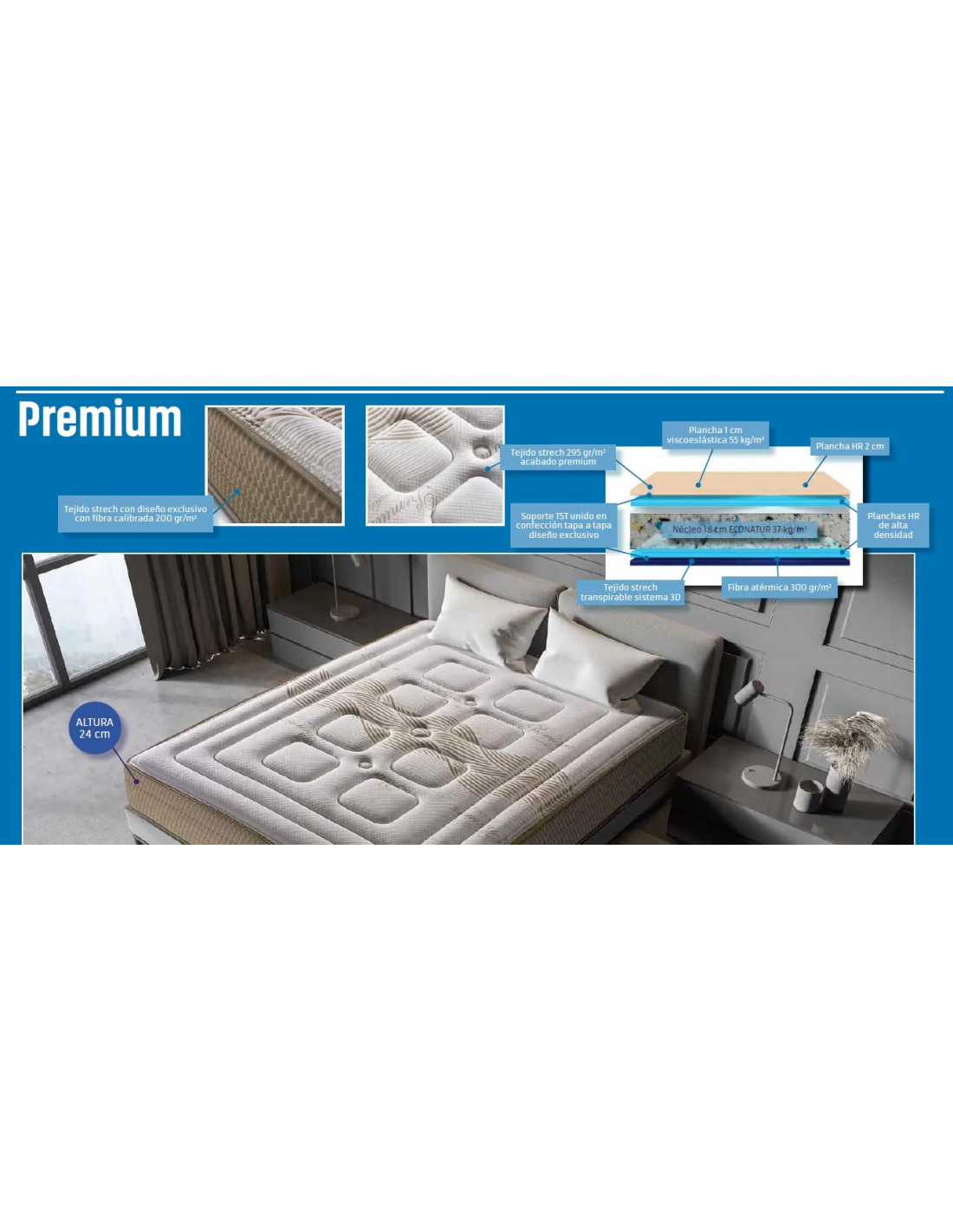 Colchón modelo Premium de firmeza alta con núcleo es de HR de alta densidad de 18cm de grosor. Tiene una altura total de 24cm. Tapizado en tejido strech de 295 gr alta calidad acabado premium en el acolchado superior.