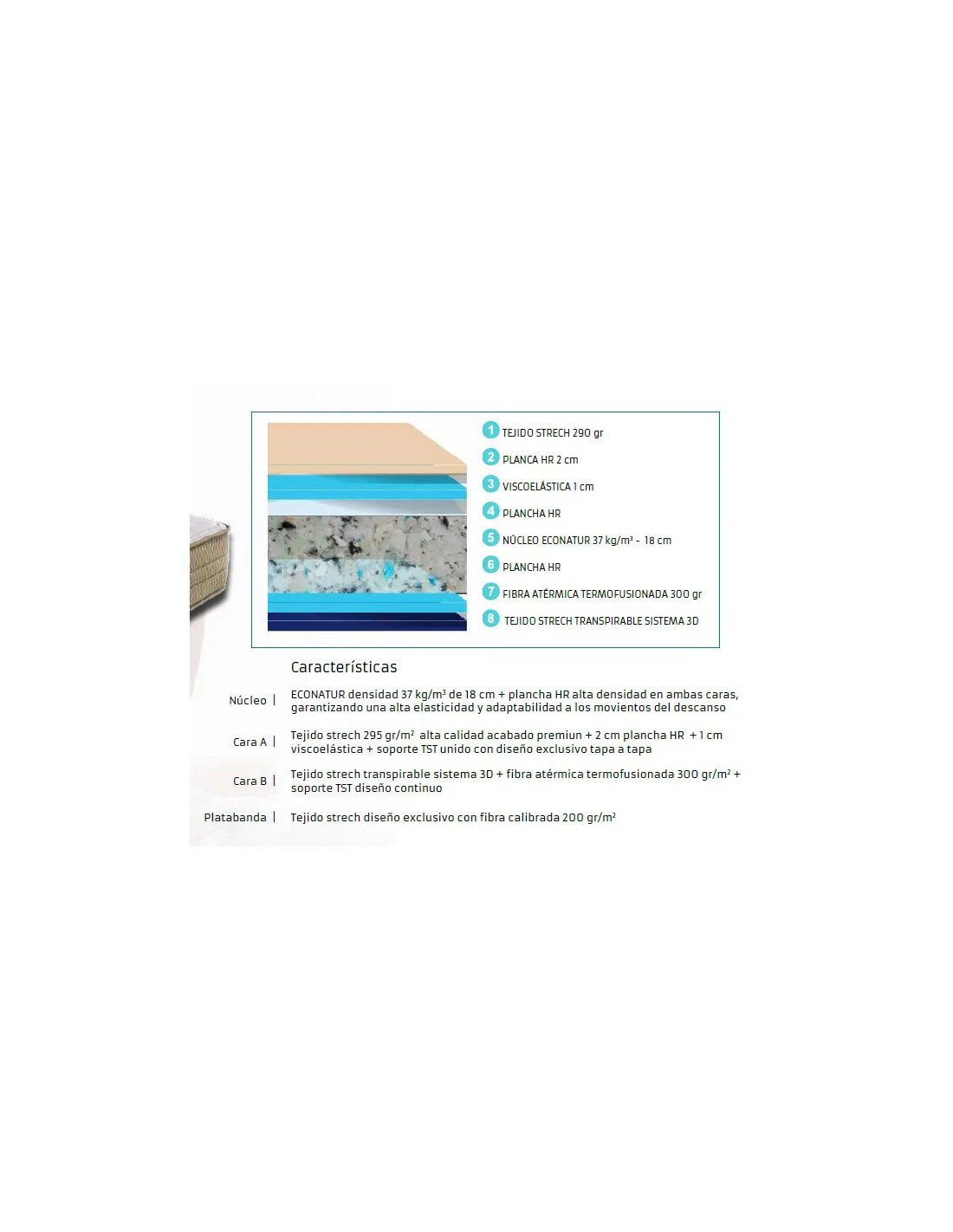 ACOLCHADO TEJIDO SUPERIOR: Tejido strech 295 gr/m2 alta calidad acabado premium, HR 2 cm + viscoelástica 1 cm + soporte TST unido en confección tapa a tapa diseño exclusivo.