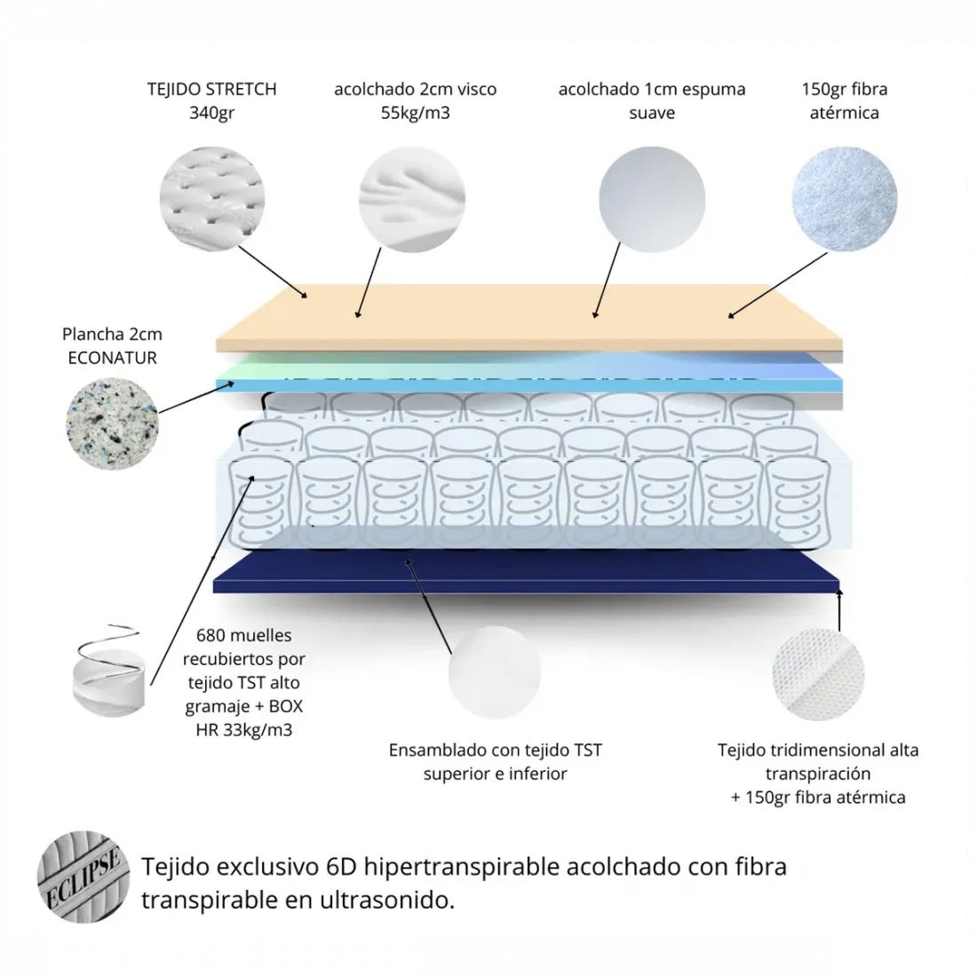 Núcleo | 680 muelles ensacado recubiertos tejido TST + BOX HR 33 kg/m3 ensamblado con tejido TST superior e inferior + plancha 2 cm ECONATUR alta densidad