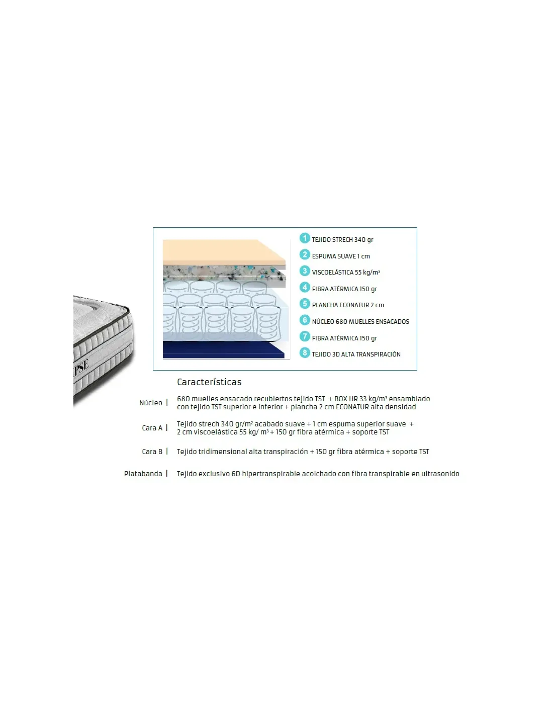 Cara A | Tejido strech 340 gr/m2 acabado suave + 1 cm espuma superior suave + 2 cm viscoelástica 55 kg/ m3 + 150 gr fibra atérmica + soporte TST