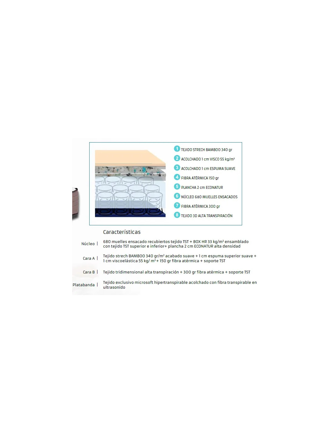 ACOLCHADO TEJIDO SUPERIOR: Tejido strech bamboo 340 gr/m2 acabado suave espuma superior suave 1 cm + viscoelástica 55kg/m3 de 1 cm + 150 gr fibra atérmica + soporte TST unido en confección tapa a tapa con diseño exclusivo.