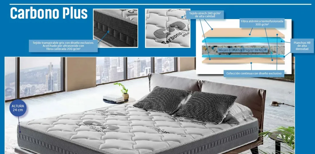 El colchón Carbono Plus destaca por su composición y núcleo hr de alta densidad de 24cm de grosor, consiguiendo un modelo de gran firmeza. Muy confortable. Disponible en ocho medidas diferentes.