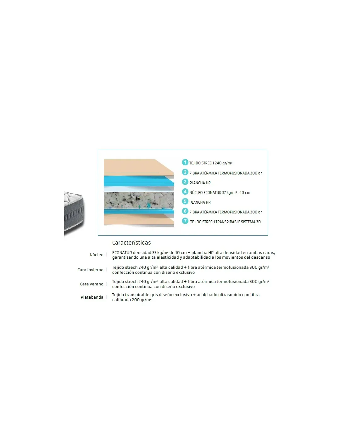 NÚCLEO: Núcleo ECONATUR 37 kg/m3 de 10 cm de grosor con plancha HR alta densidad para garantizar una alta elasticidad y adaptabilidad a los movimientos propios del descanso.