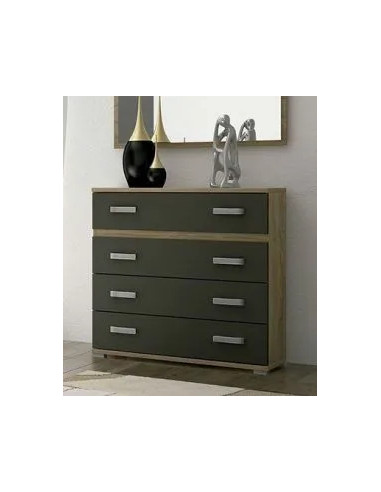 Espacioso comodín de cuatro cajones de la serie Priego en cambria combinado con grafito, acabado elegante y versátil para tu dormitorio.