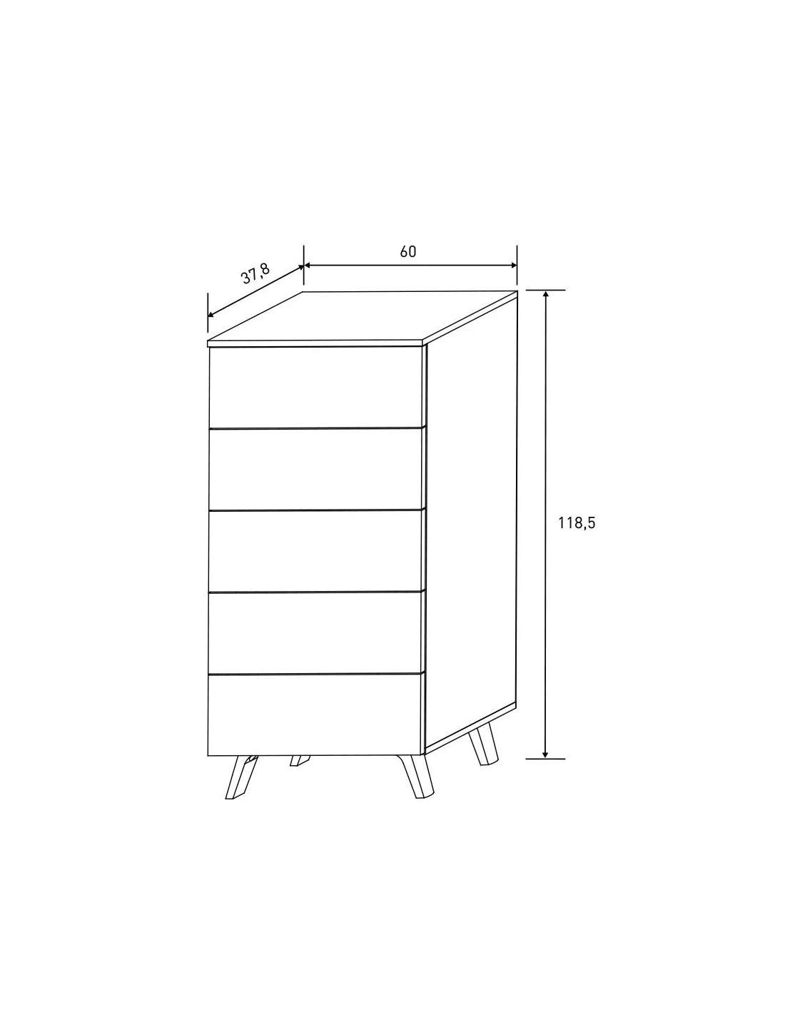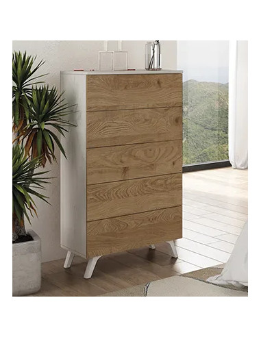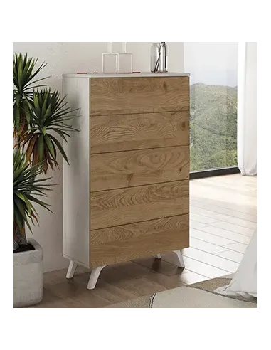 Sinfonier moderno que da luz al dormitorio. Con 5 cajones perfectos para colocar fulares, complementos, camisetas y jerseys. Con 60cm. de ancho.