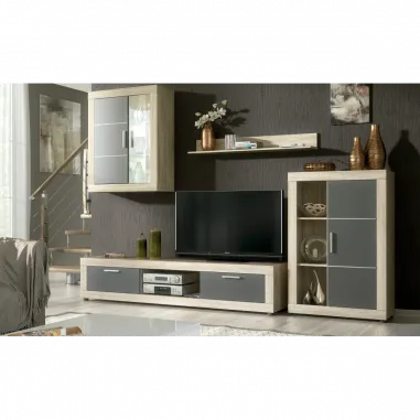 Composición de salón ideal para ambientes de salón modernos, con gran cantidad de almacenaje. Dispone de un bajo con dos puertas y huecos para los periféricos, un bodeguero con puerta y hueco con estantes, una vitrina colgada que combina puerta opaca y cristal que muestra unas originales luces leds en el interior, y una balda simple para pared. Es una composición única de la que no se pueden comprar los módulos por separado, pero que al ser módulos independientes si se pueden colocar al gusto.