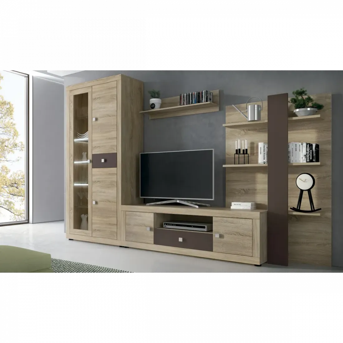 Si busca un espacio sobrio, elegante, esta es la composición ideal para su salón. La combinación de los diferentes colores con el cristal crean una mezcla perfecta. Compuesta por una gran vitrina, un gran bajo de TV, un estante de pared y una original estantería con respaldo, encontrará el espacio para cada uno de sus objetos, libros... Los herrajes son metálicos para garantizar la durabilidad del producto. La capacidad de almacenamiento de este producto está más que asegurada gracias a la multitud de espacios que presenta, tanto expositores como espacios más privados.