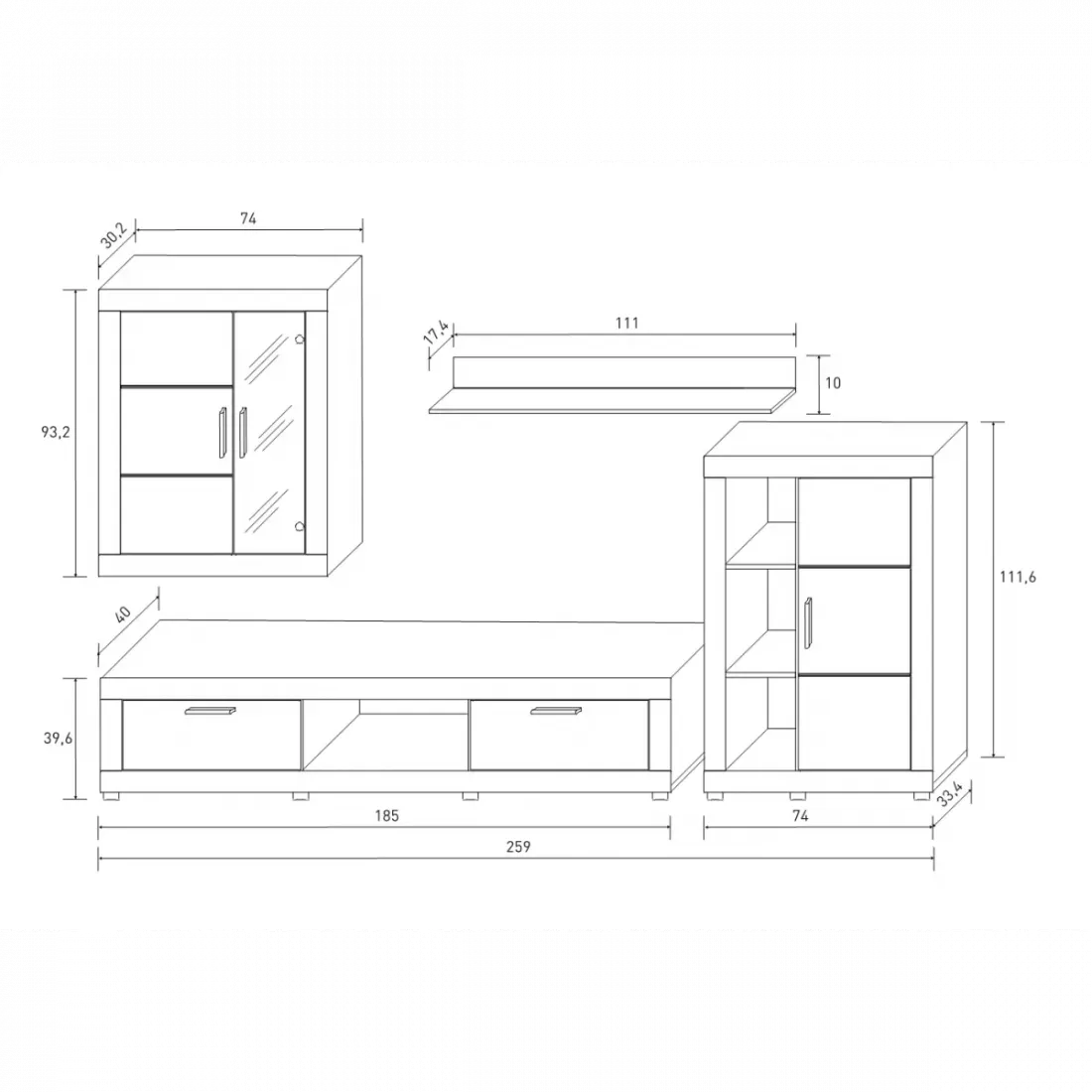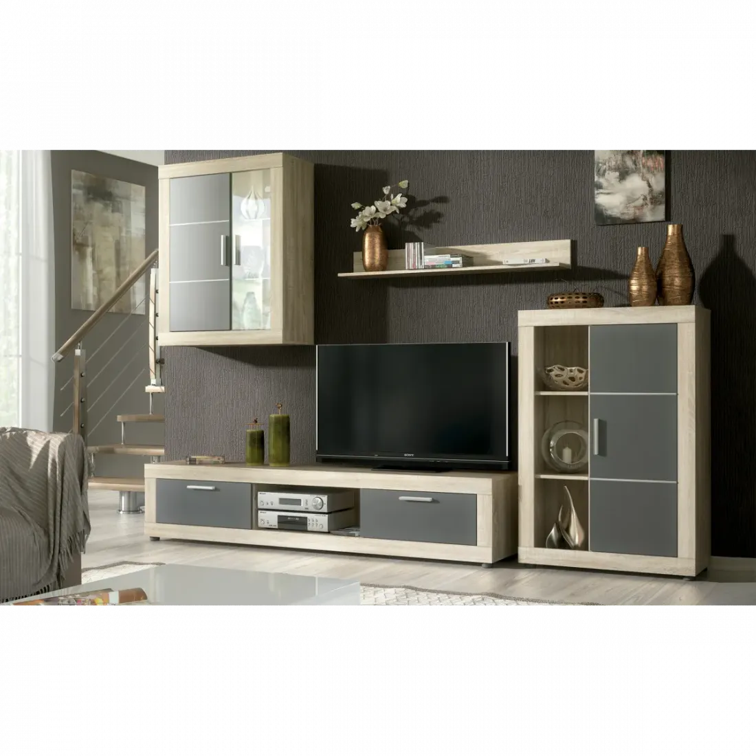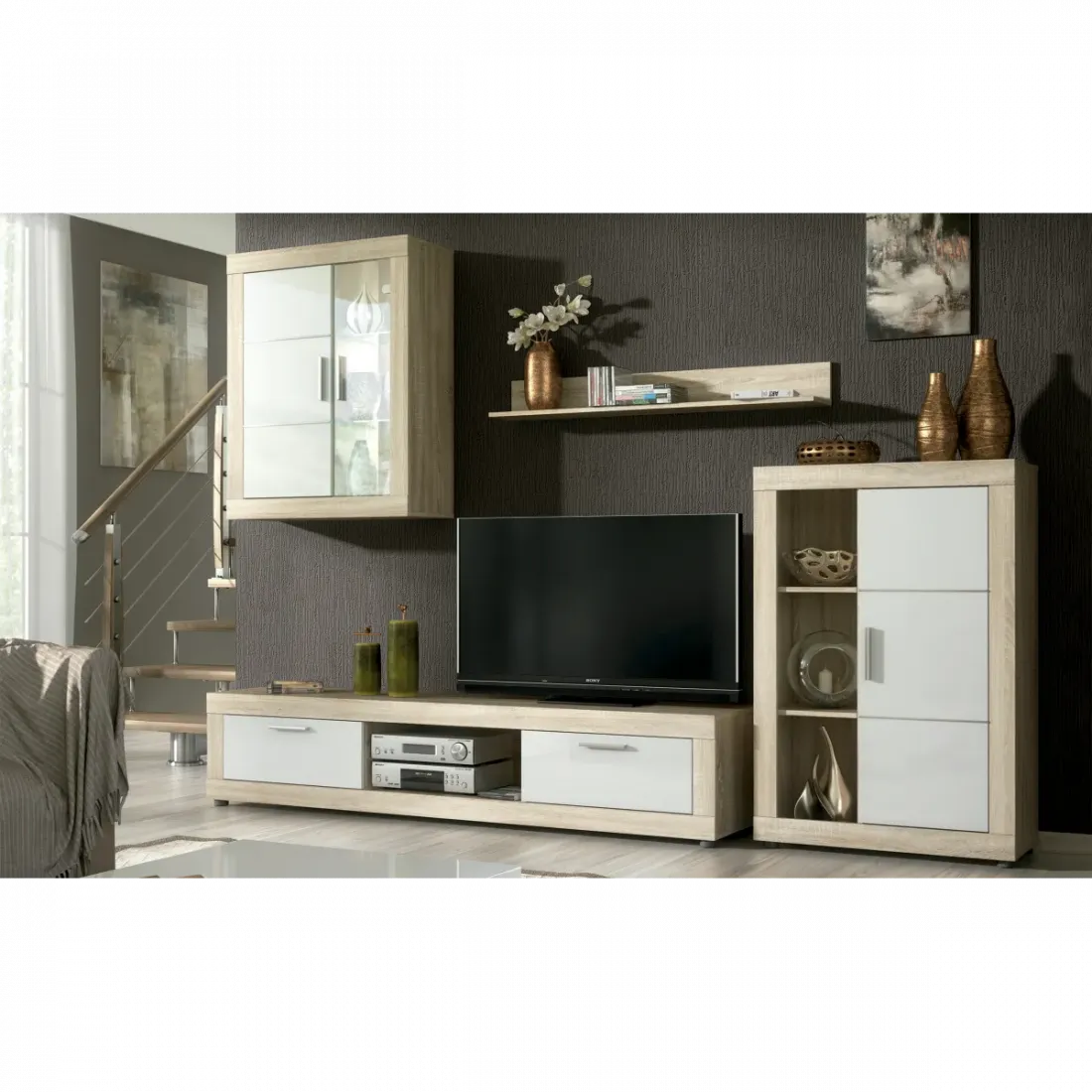 Composición de salón ideal para ambientes de salón modernos, con gran cantidad de almacenaje. Dispone de un bajo con dos puertas y huecos para los periféricos, un bodeguero con puerta y hueco con estantes, una vitrina colgada que combina puerta opaca y cristal que muestra unas originales luces leds en el interior, y una balda simple para pared. Es una composición única de la que no se pueden comprar los módulos por separado, pero que al ser módulos independientes si se pueden colocar al gusto.