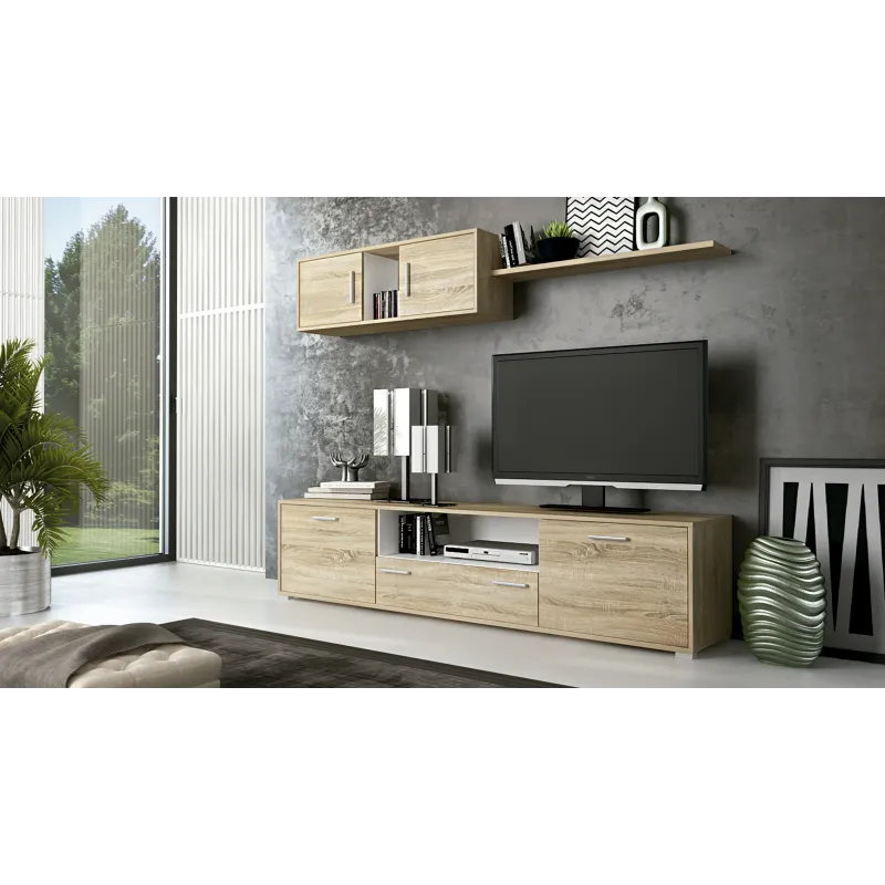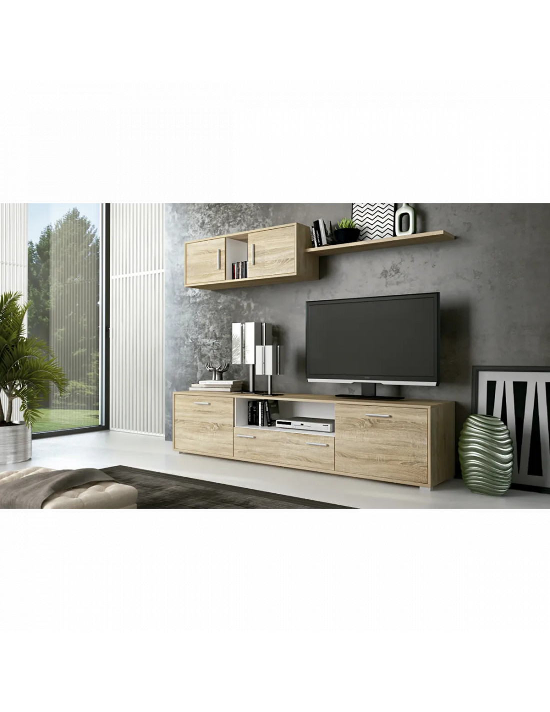 Composición económica de salón, con varias puertas para guardar y huecos para decoración. Es una composición única por lo que no se pueden comprar los módulos por separado.