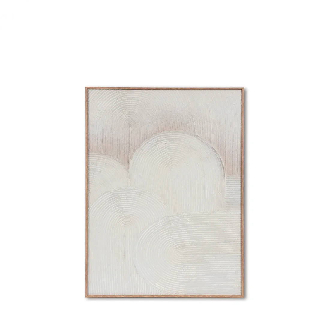 Suave y sereno, KARES propone una mirada al equilibrio a través de formas curvas y líneas concéntricas que fluyen sobre un lienzo texturizado. La composición, en tonos blancos y beige empolvado, evoca paisajes ondulantes o nubes suspendidas, generando una sensación de calma visual inmediata.