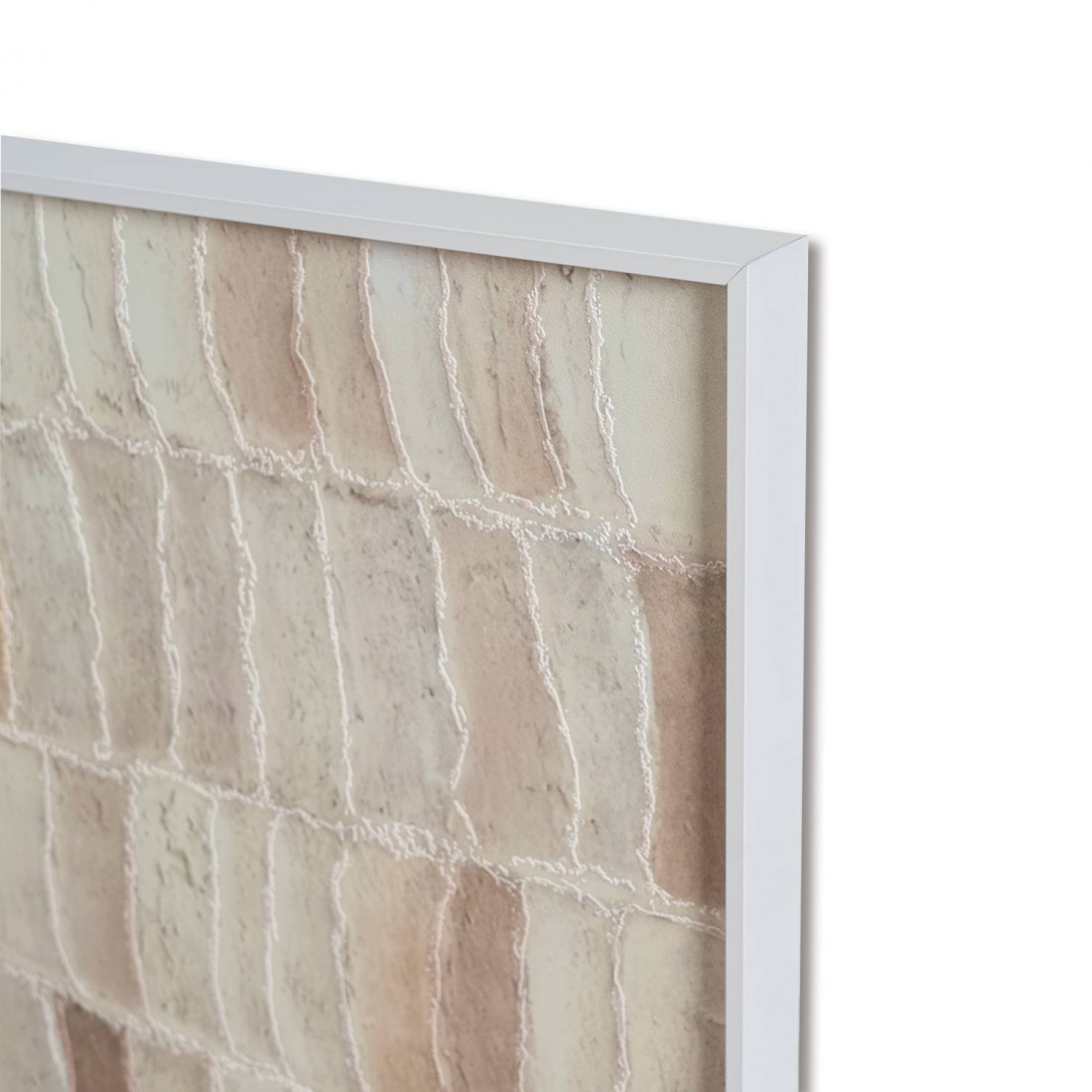 El marco de aluminio en acabado blanco aporta un contraste limpio que potencia la sensación de luz y modernidad. Su formato de 60x80 cm lo convierte en una pieza versátil, ideal para ambientes contemporáneos, neutros o minimalistas que buscan añadir relieve sin sobrecargar.