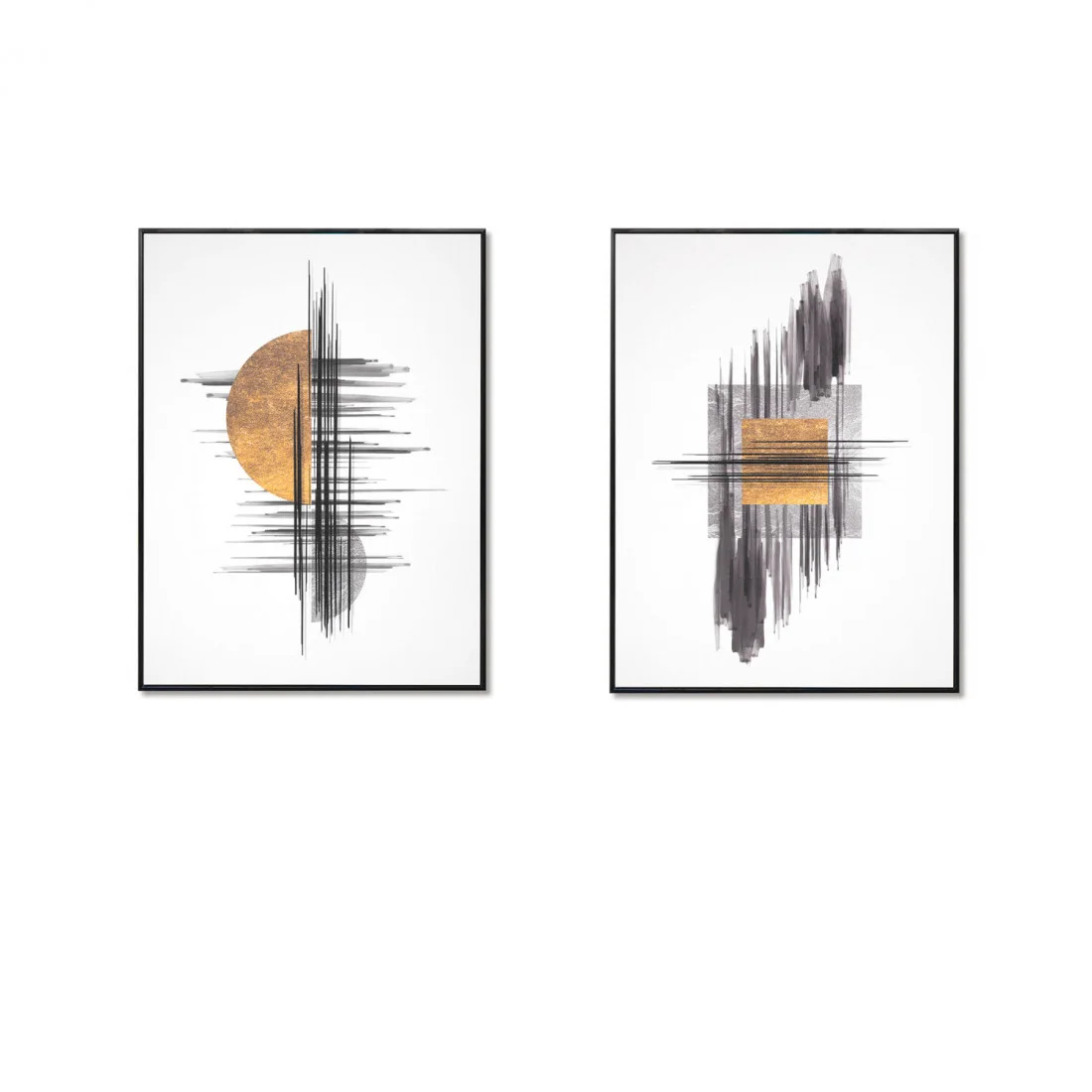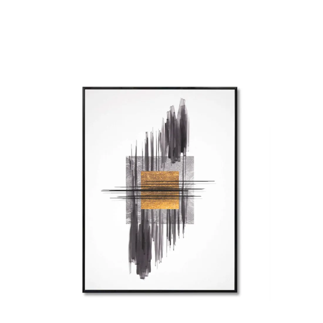 Una composición fragmentada, casi tectónica, define el carácter del cuadro DRYLAND. Líneas finas atraviesan superficies irregulares donde los tonos beige, negro, blanco y ocre se equilibran con naturalidad. La textura del lienzo aporta matices sutiles que refuerzan la sensación de profundidad.