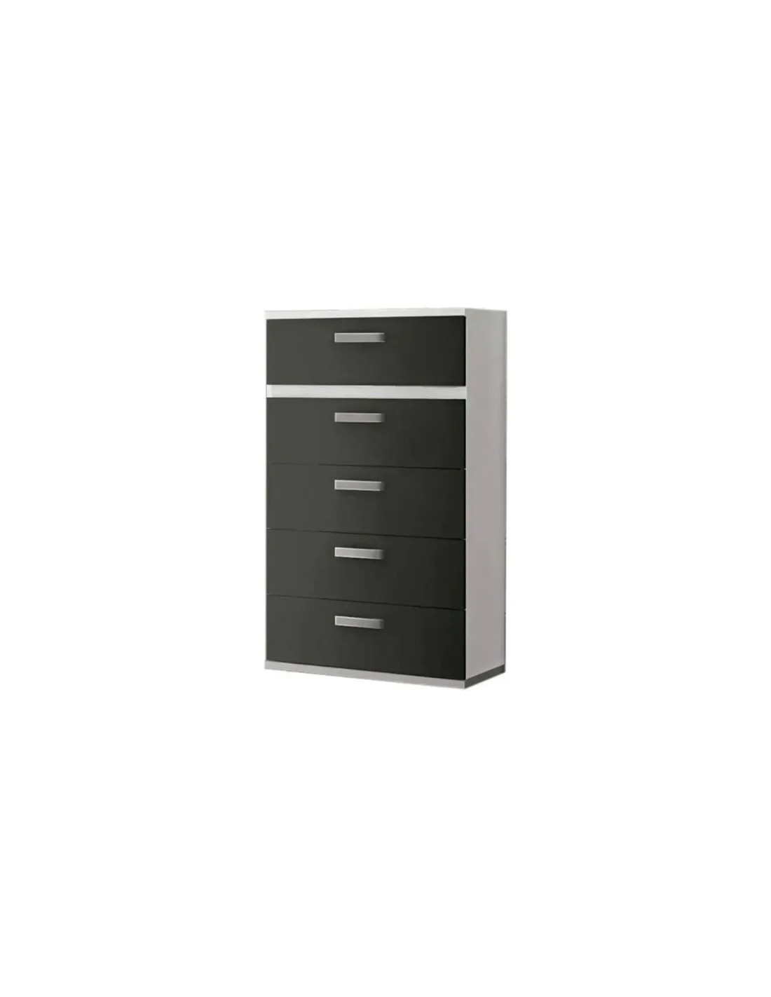 Sinfonier de cinco cajones, fabricado en melamina de alta calidad y disponible en color blanco-grafito. Combinable con el resto de productos de la serie Cabra, que encontrará en nuestra web. Se presenta en formato KIT.