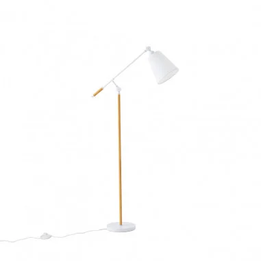 La lámpara de suelo ALOIA blanca aporta luz y frescura con un diseño que combina lo contemporáneo con sutiles toques naturales. Su estructura de metal lacado en blanco transmite ligereza visual, mientras que los detalles metálicos con acabado efecto madera añaden calidez y un guiño orgánico muy equilibrado.