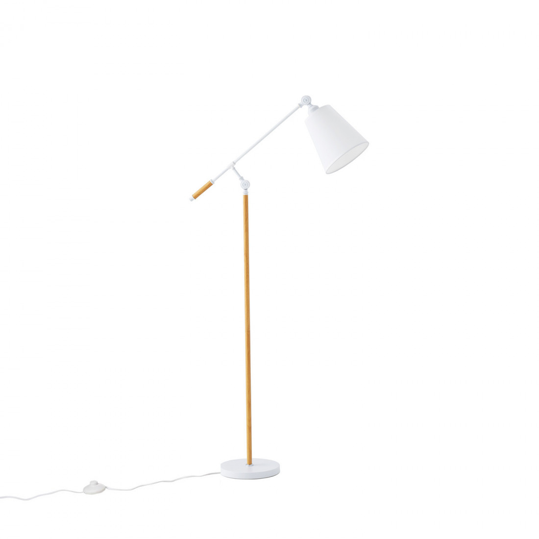 La lámpara de suelo LACHAR fusiona lo natural con lo contemporáneo en un diseño equilibrado y lleno de estilo. Su estructura metálica en color blanco sostiene una pantalla de rafia, que aporta textura, calidez y una luz suave y acogedora.