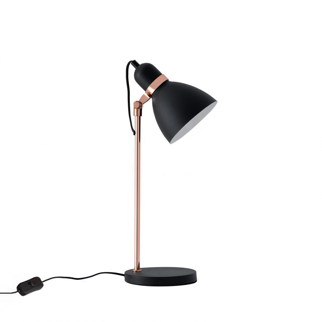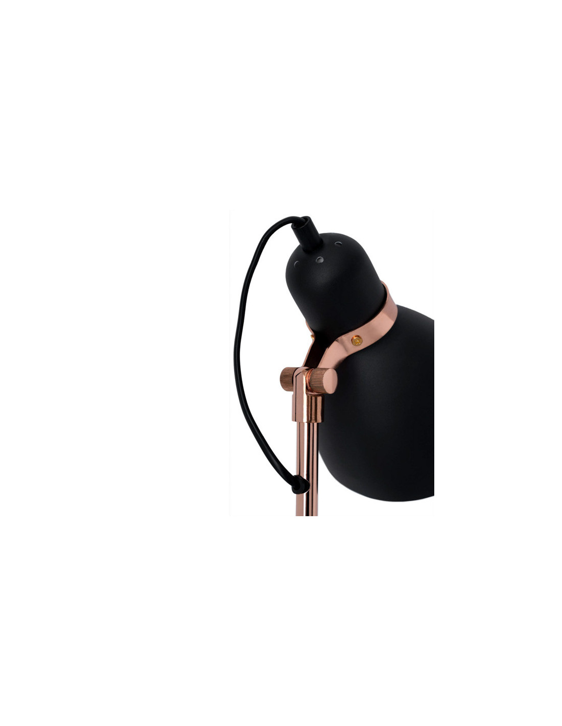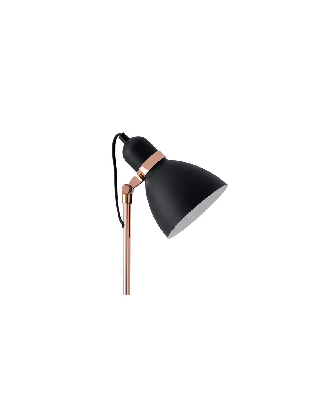 La lámpara de sobremesa GRISEL combina carácter industrial con un toque elegante, gracias a su estructura de metal negro y detalles en cobre metálico que aportan calidez y sofisticación.