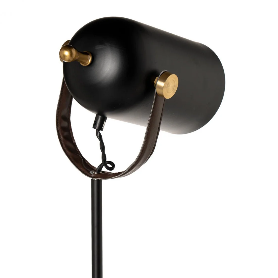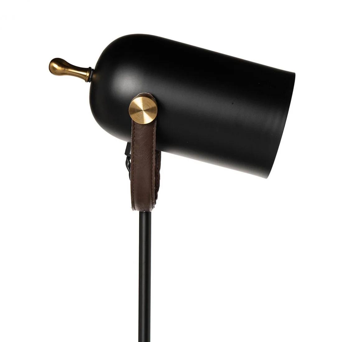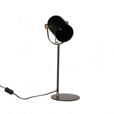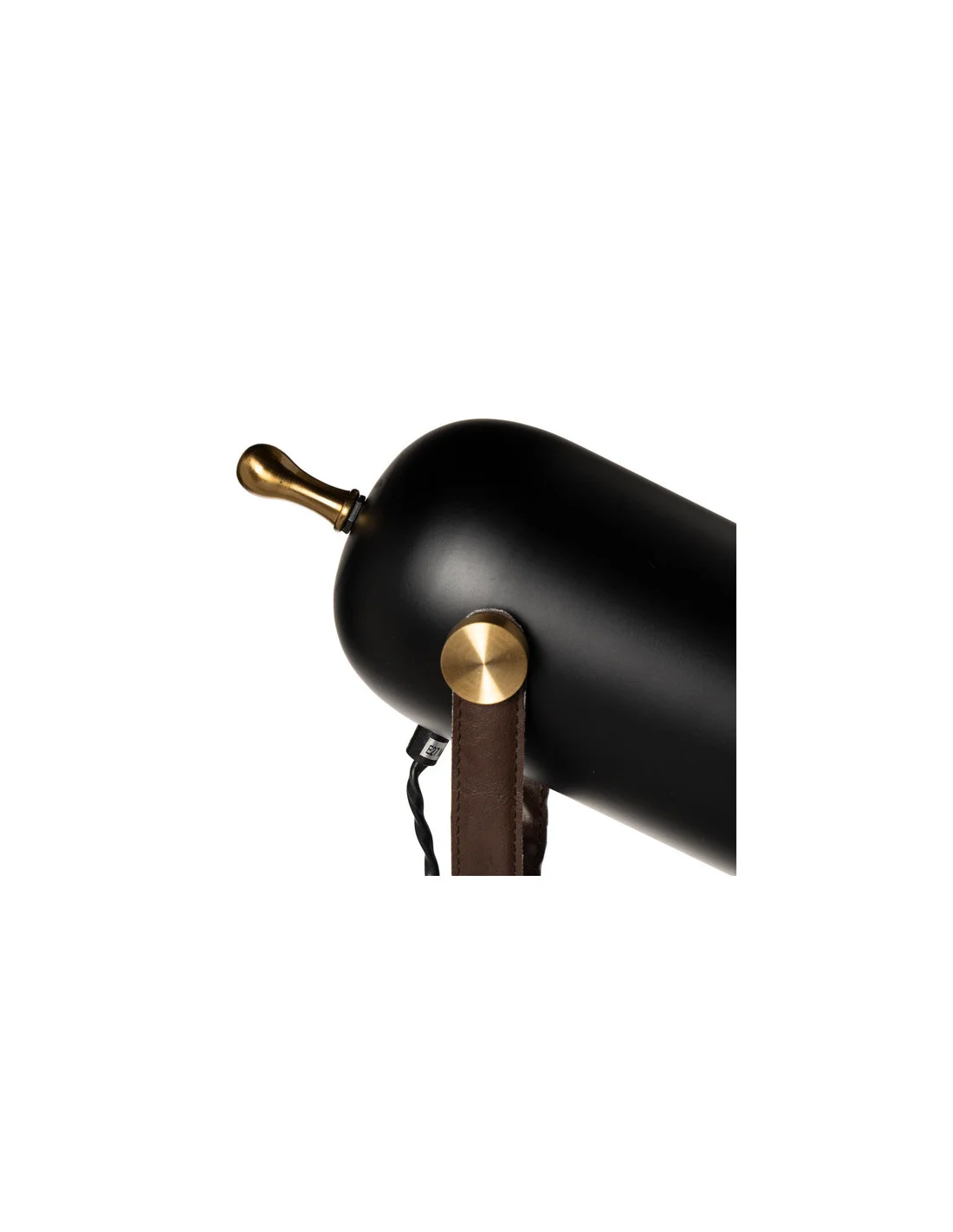 Su cuerpo de metal negro contrasta con los detalles en latón y con la correa de cuero, perfecta para crear ambientes llenos de personalidad.