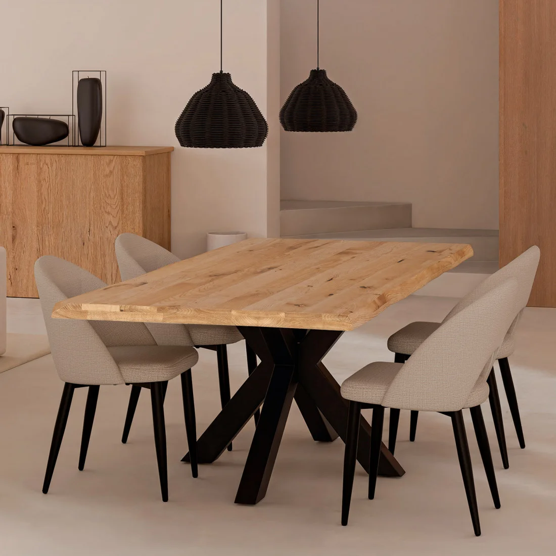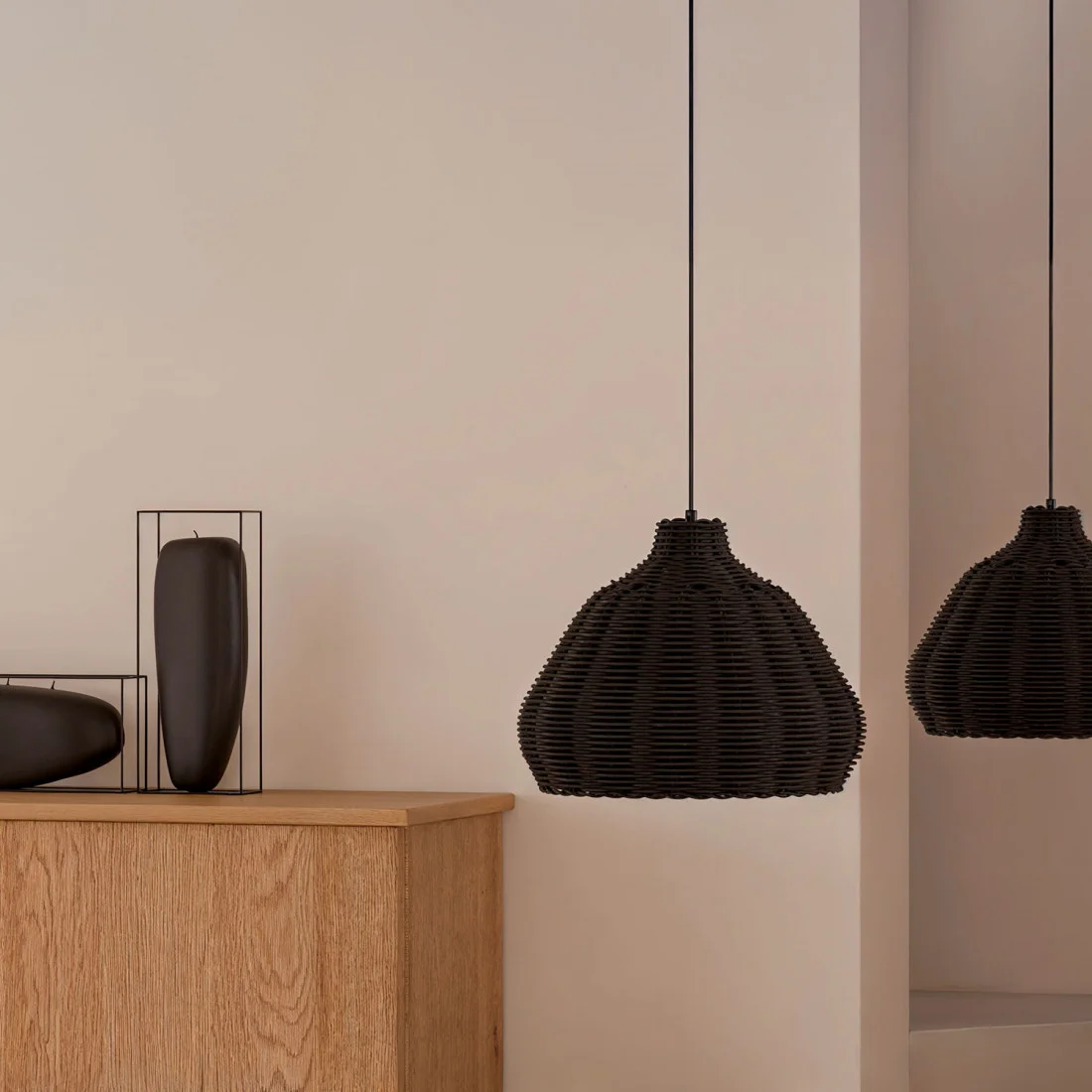 Disponible en dos versiones —negro para un look más sobrio y moderno, o ratán natural con detalles blancos para una estética fresca y luminosa—, es ideal para comedores, cocinas o salones de estilo boho, mediterráneo o japandi. SERRA ilumina con suavidad y decora con autenticidad.