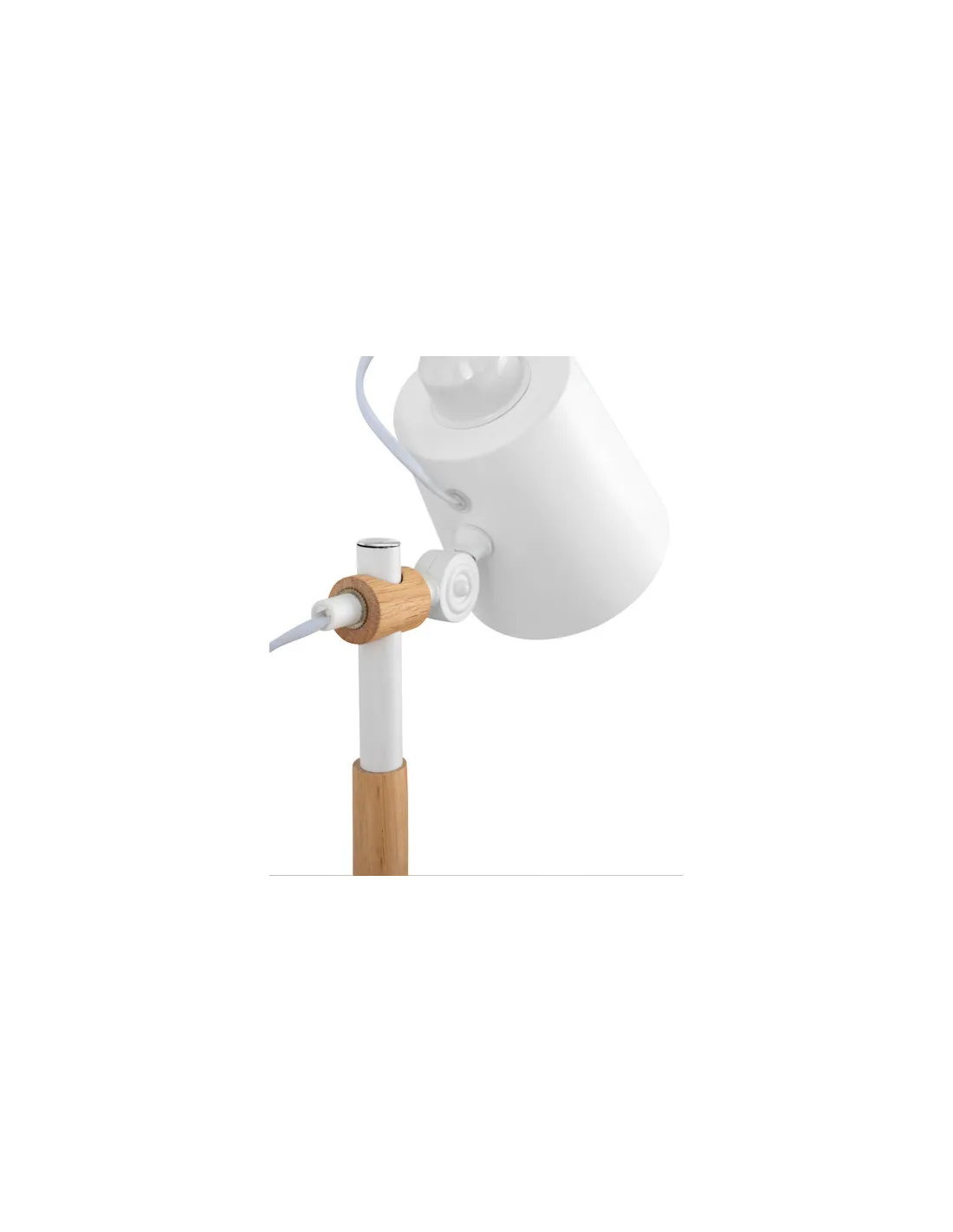 Fabricada en metal, la lámpara IRIA presenta un elegante acabado en color blanco que aporta sofisticación a cualquier espacio. Su estructura incluye detalles en madera natural, creando un contraste armónico y atractivo.