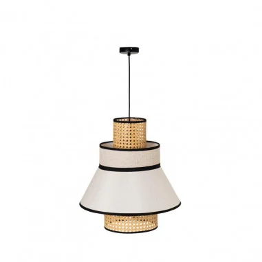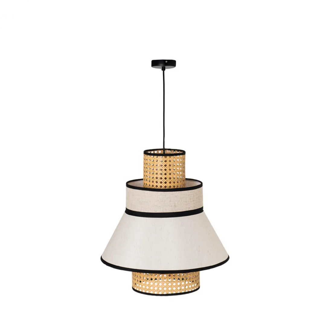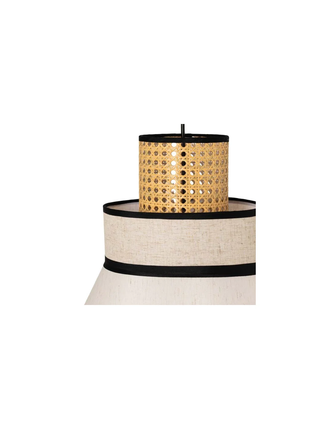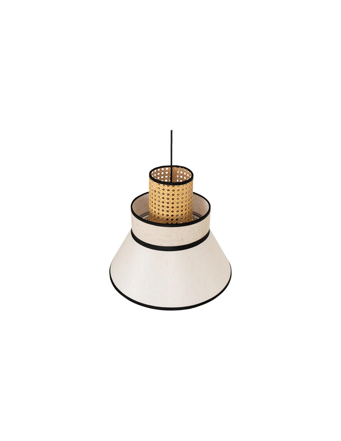 Lámpara de techo que combina tela y fibra natural trenzada, aportando un toque de artesanía y calidez al espacio.