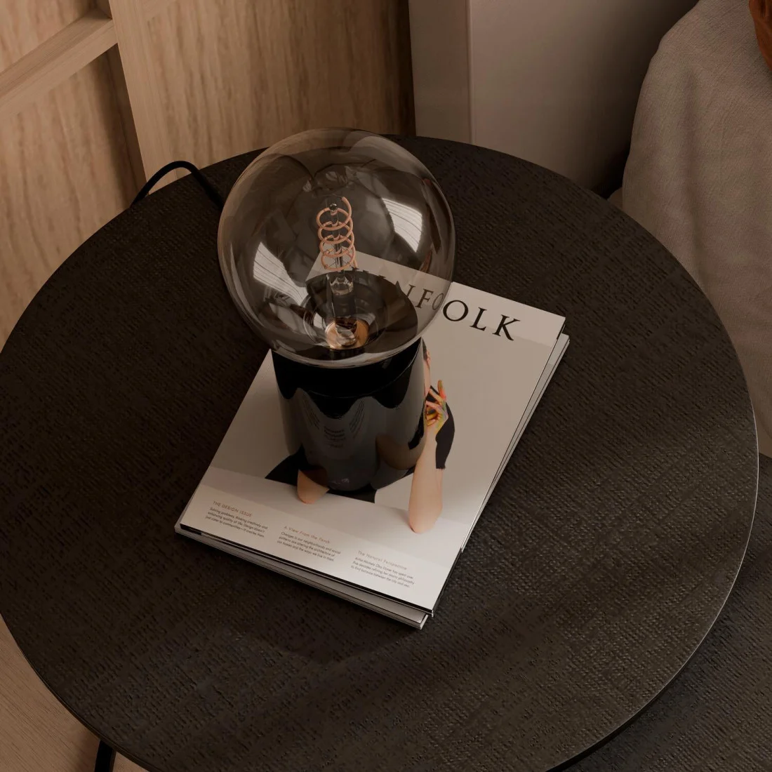 La lámpara de sobremesa GRISEL combina carácter industrial con un toque elegante, gracias a su estructura de metal negro y detalles en cobre metálico que aportan calidez y sofisticación.