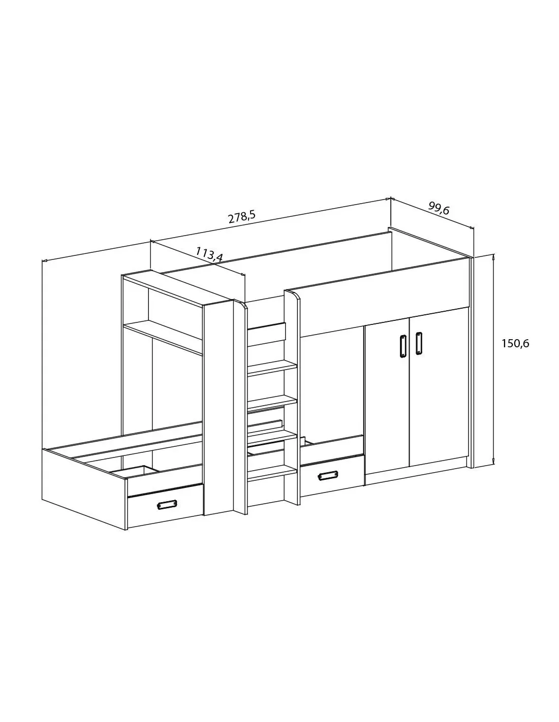 Cama tren con armario incluido y en la cama inferior dos cajones para guardar cosas. Incluye la escalera.