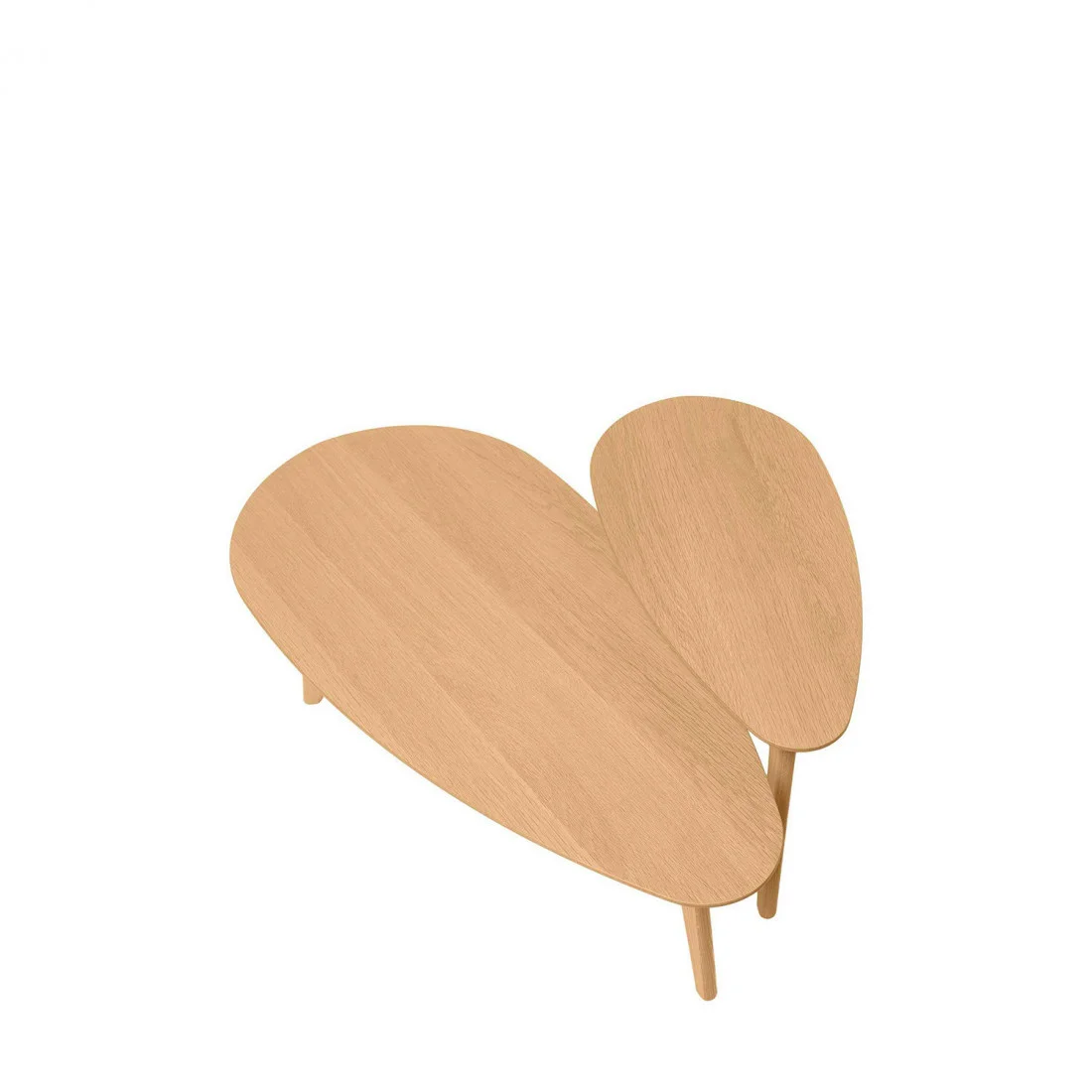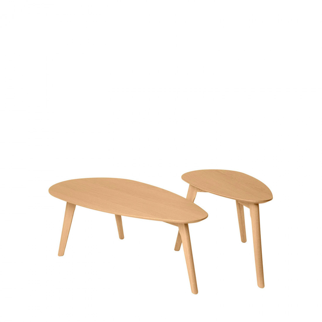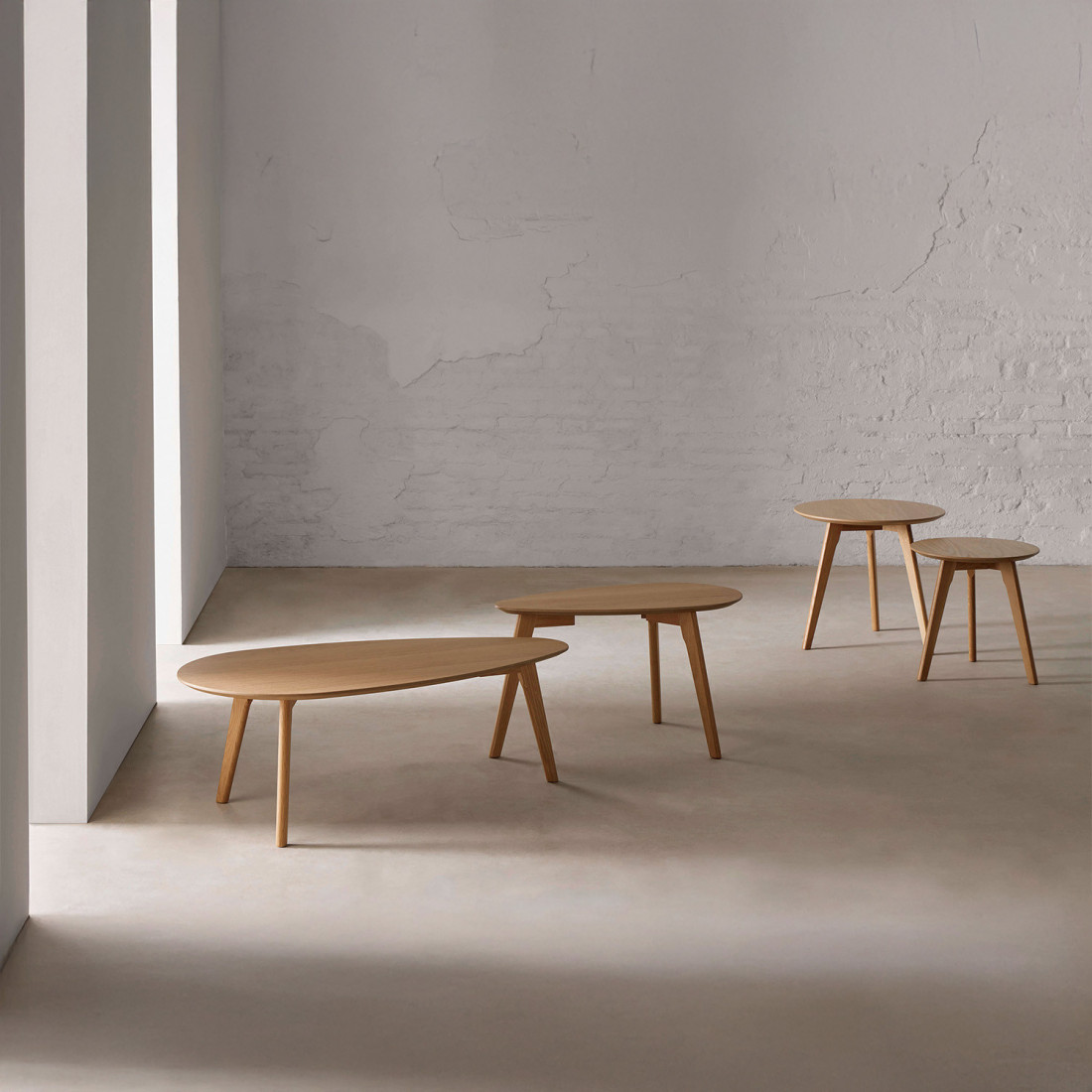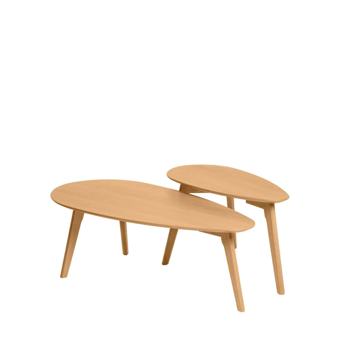 Cada mesa del set de mesas de centro CONRAD presenta una tapa en chapa de roble que resalta las vetas y tonalidades orgánicas de la madera, creando un ambiente acogedor y elegante.