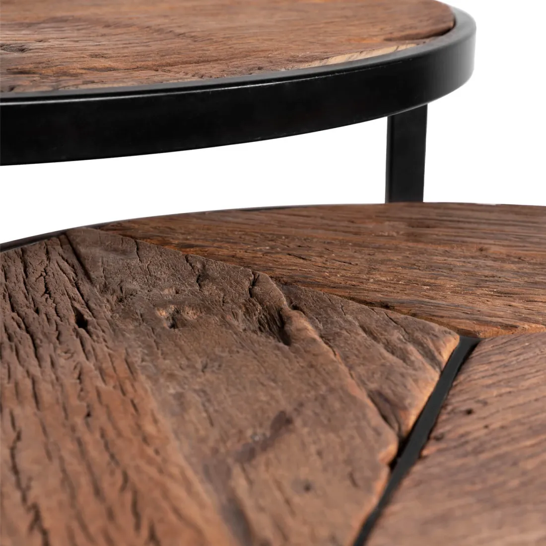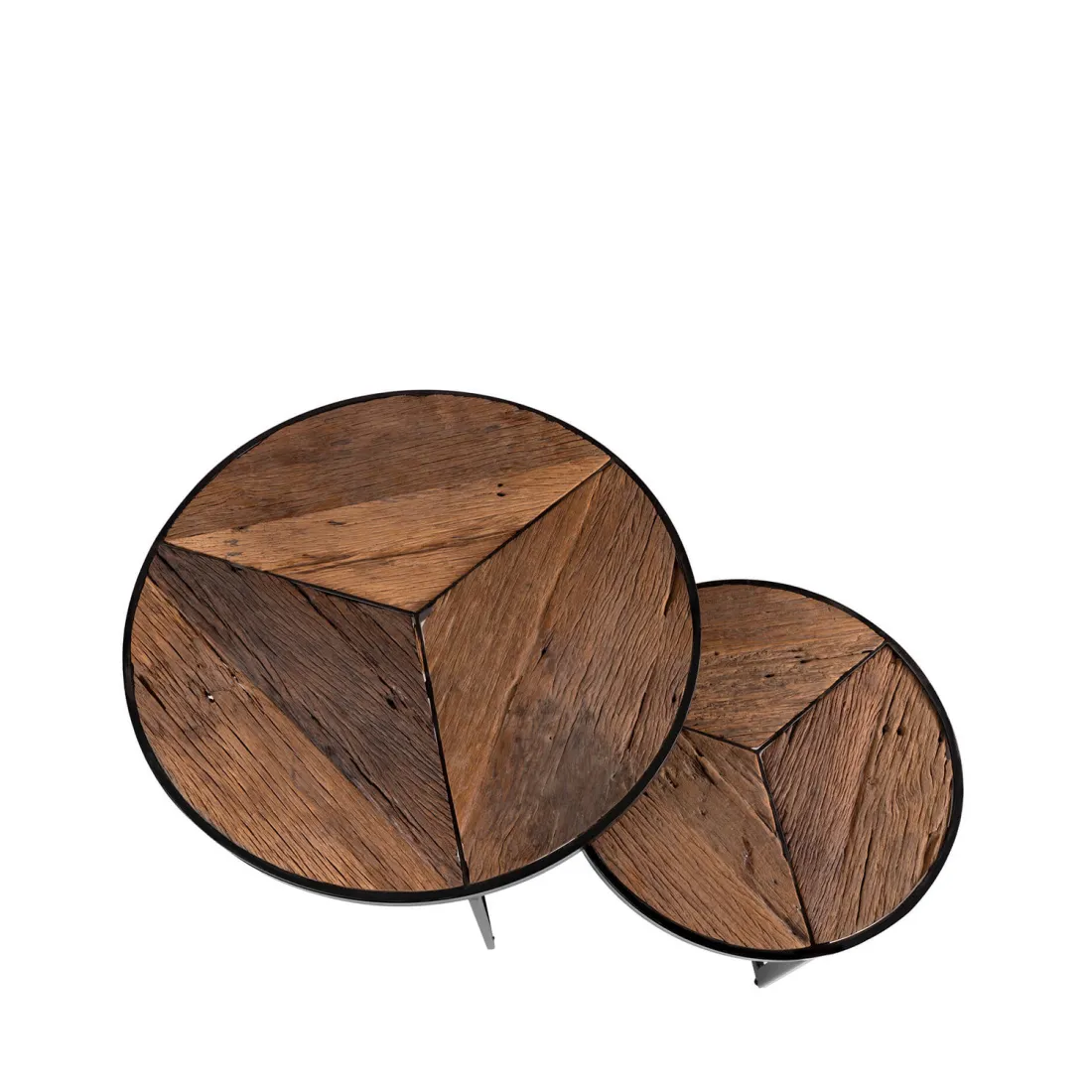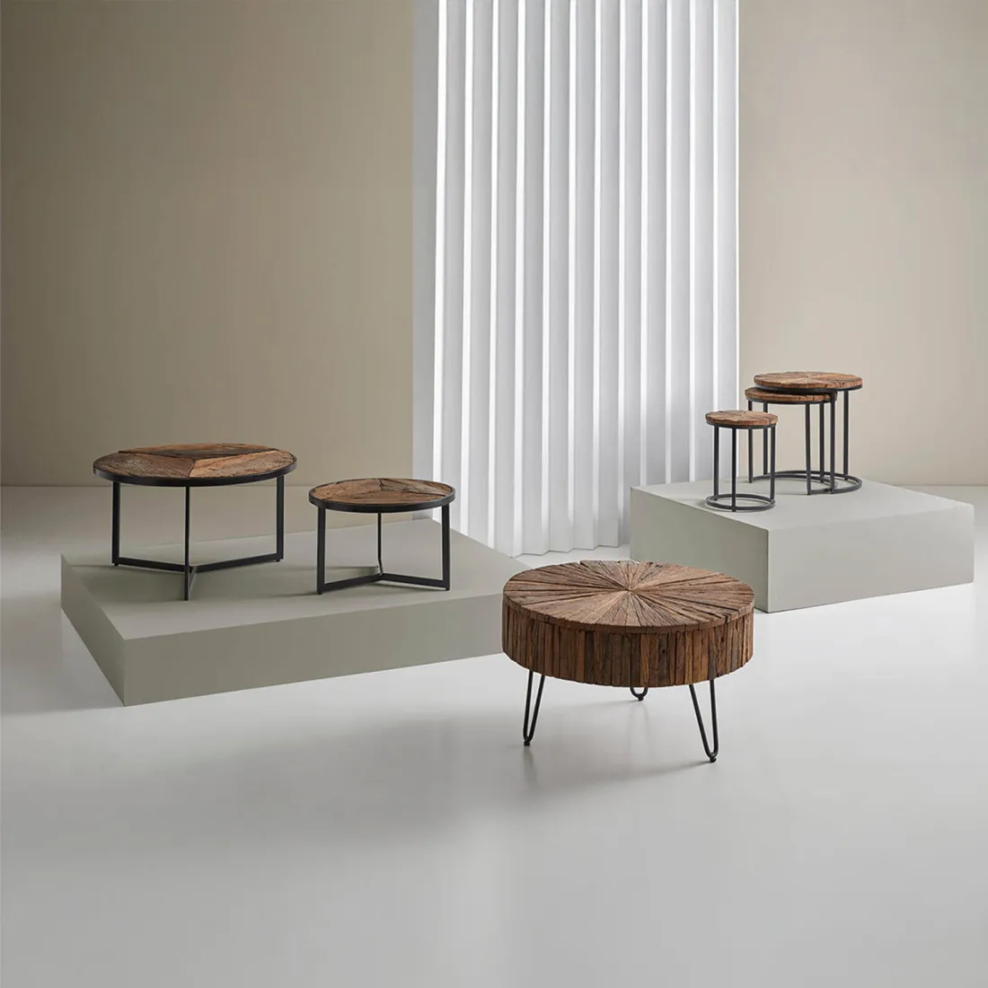 El set de mesas de centro ZAID aporta un toque rústico y contemporáneo con su diseño que combina materiales naturales y acabados industriales.