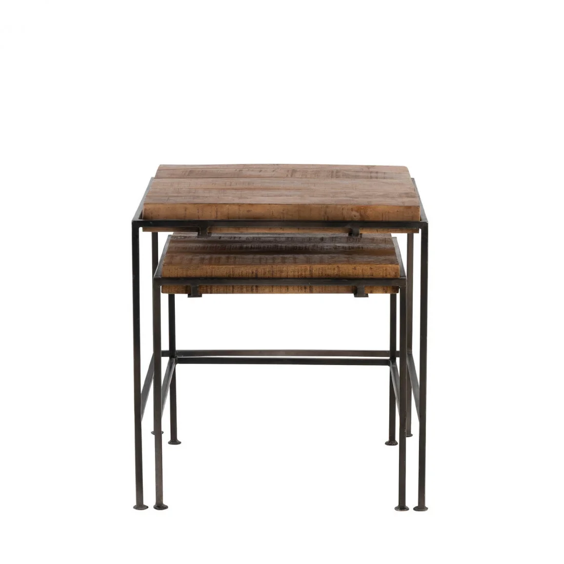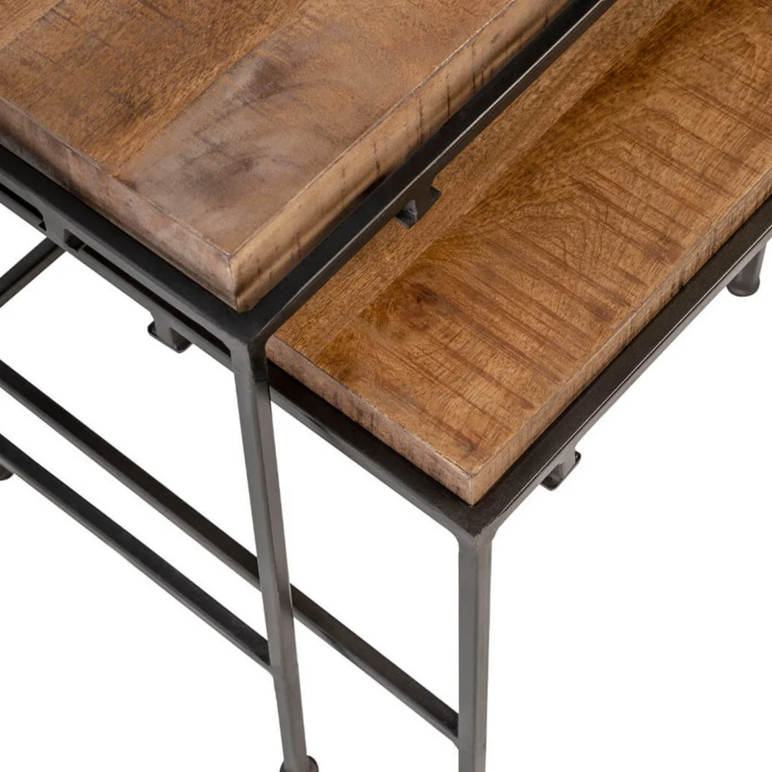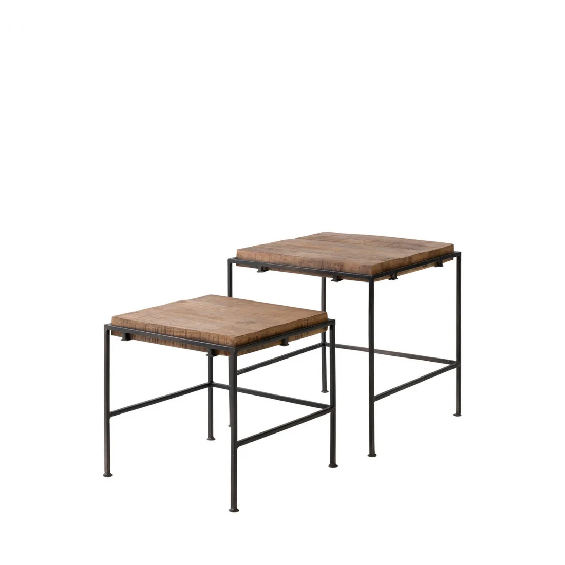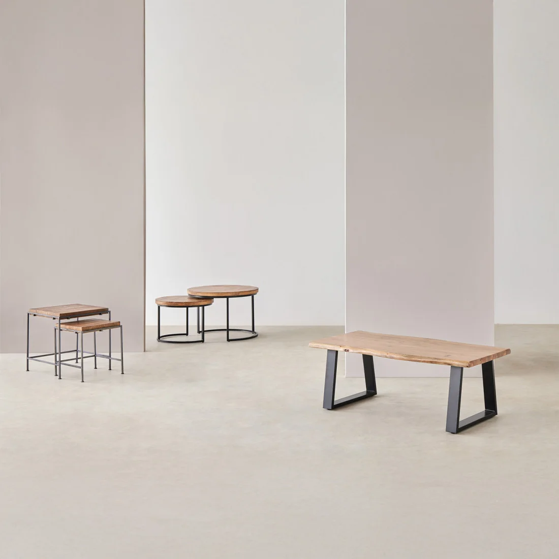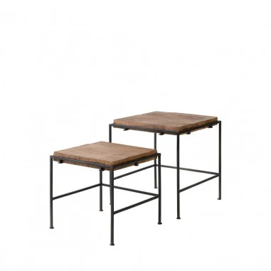 Las patas de hierro negro contrastan con la madera, aportando firmeza y un aire moderno que equilibra la estética del conjunto. Gracias a sus tamaños diferenciados, las mesas pueden utilizarse juntas o por separado, adaptándose a diferentes composiciones y necesidades.