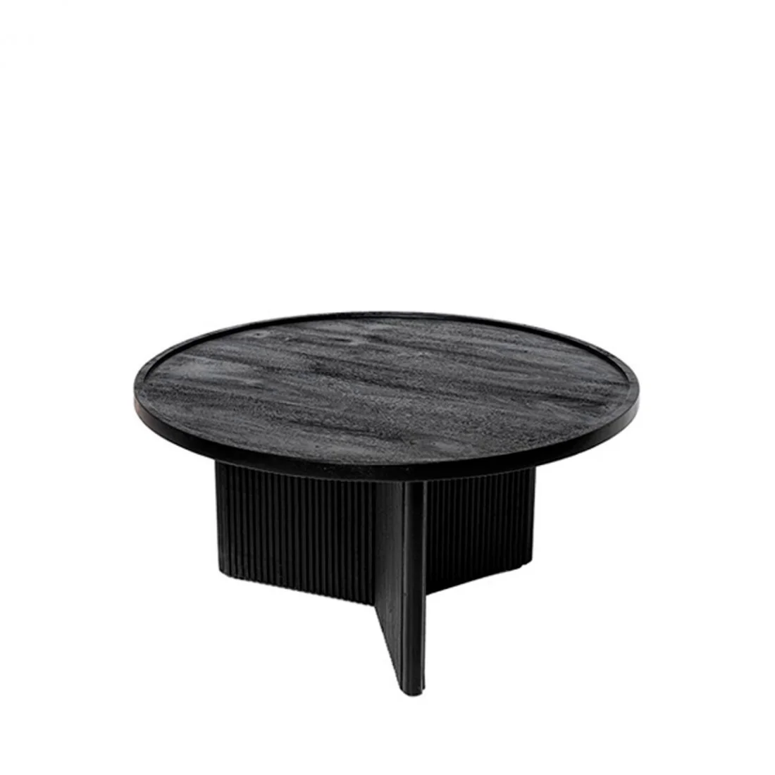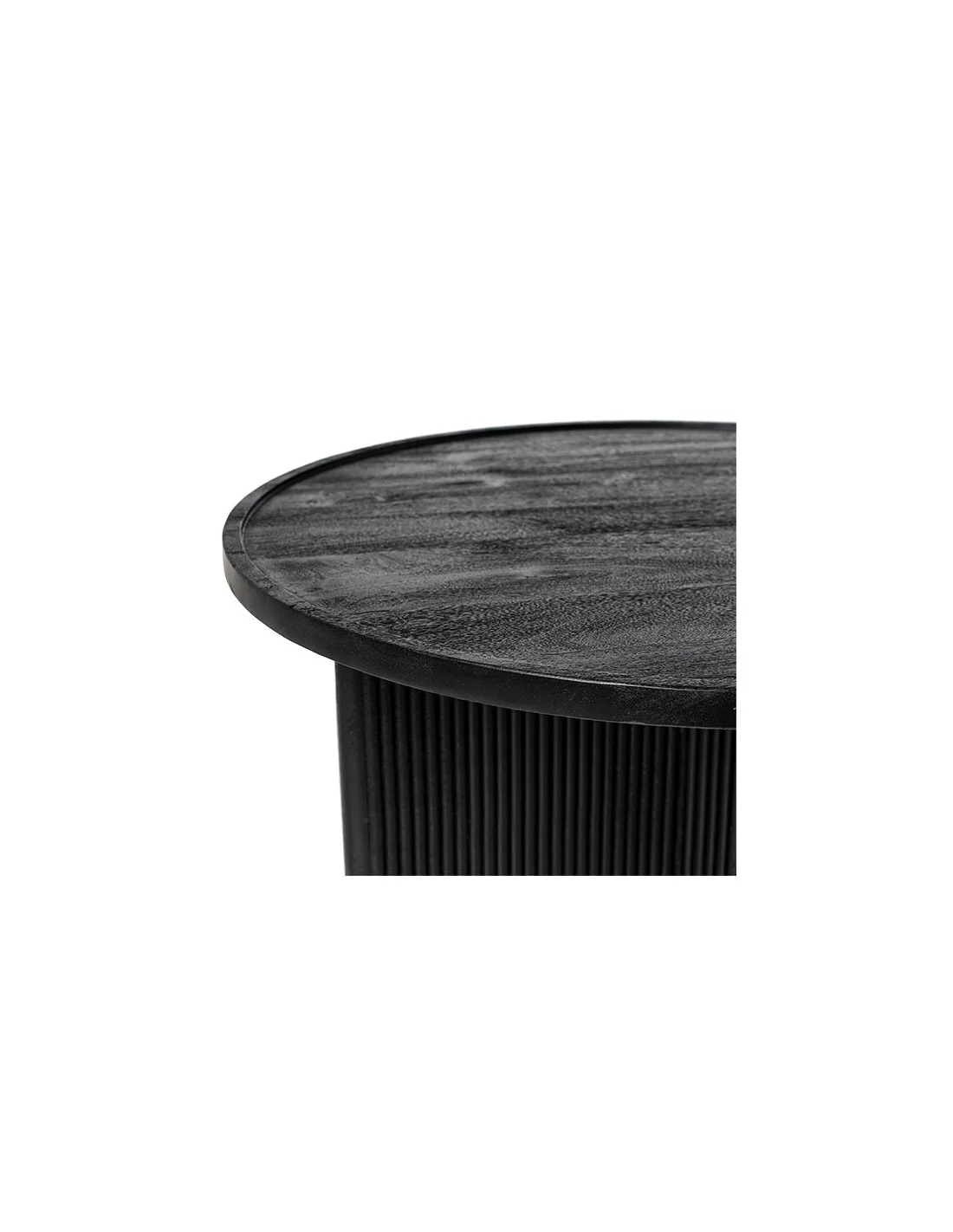 Elaborada en madera de mango con un acabado en negro profundo, su superficie muestra una textura elegante que combina a la perfección con su base decorada con relieves geométricos. Este contraste entre líneas suaves y detalles marcados aporta dinamismo y personalidad al conjunto, convirtiéndola en una pieza versátil para ambientes modernos o industriales.