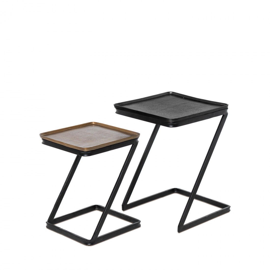 El set de mesas auxiliares NIHAL combina materiales y formas para crear un diseño industrial con un toque contemporáneo. Las superficies están realizadas en aluminio, presentando un acabado pulido y elegante que refleja sutilmente la luz, mientras que las patas de hierro negro añaden estabilidad y un contraste audaz que potencia su estilo moderno.