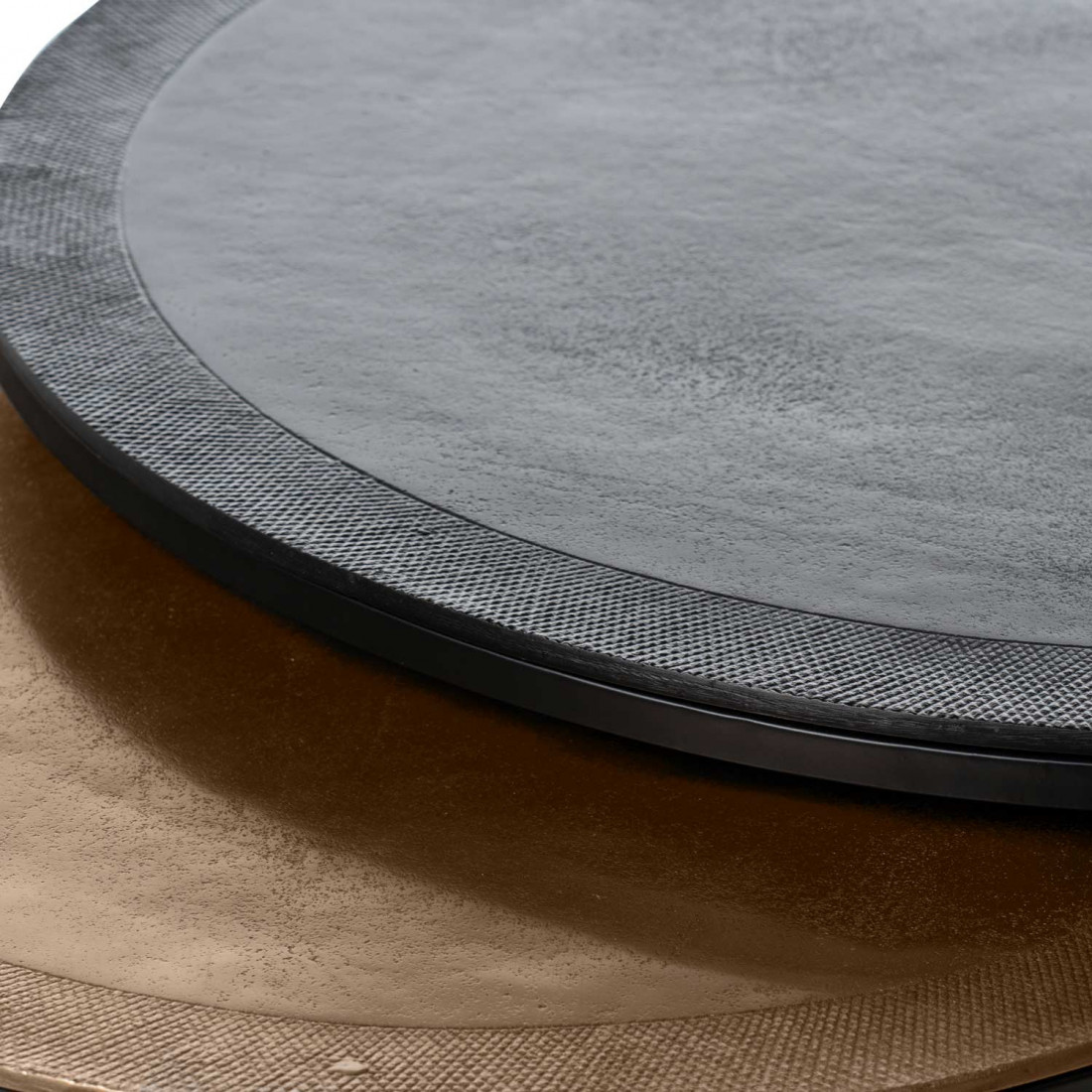 Además, la superficie de las mesas está adornada con un borde externo elaborado en el propio metal, un detalle que añade un toque distintivo y exótico al diseño.