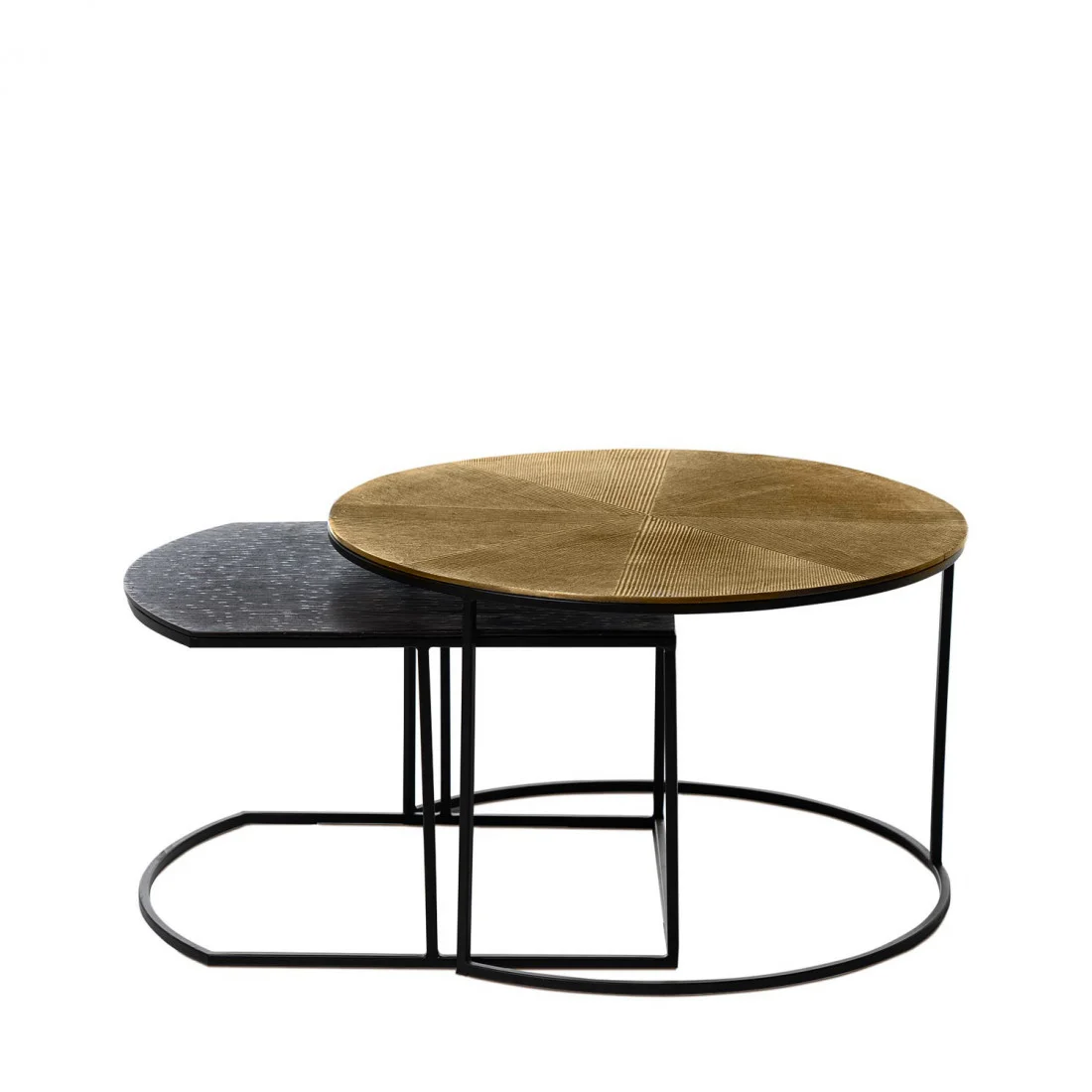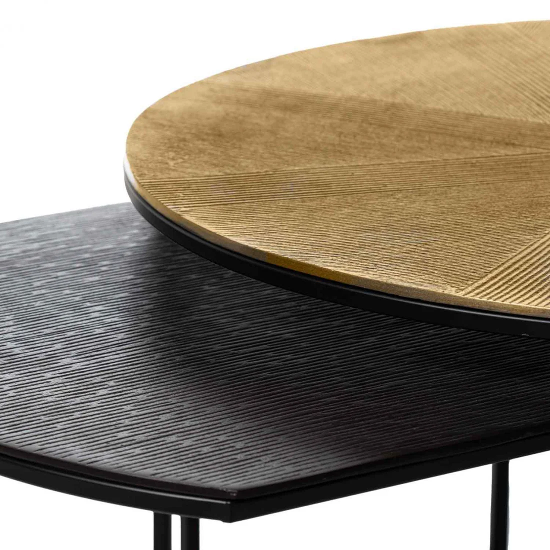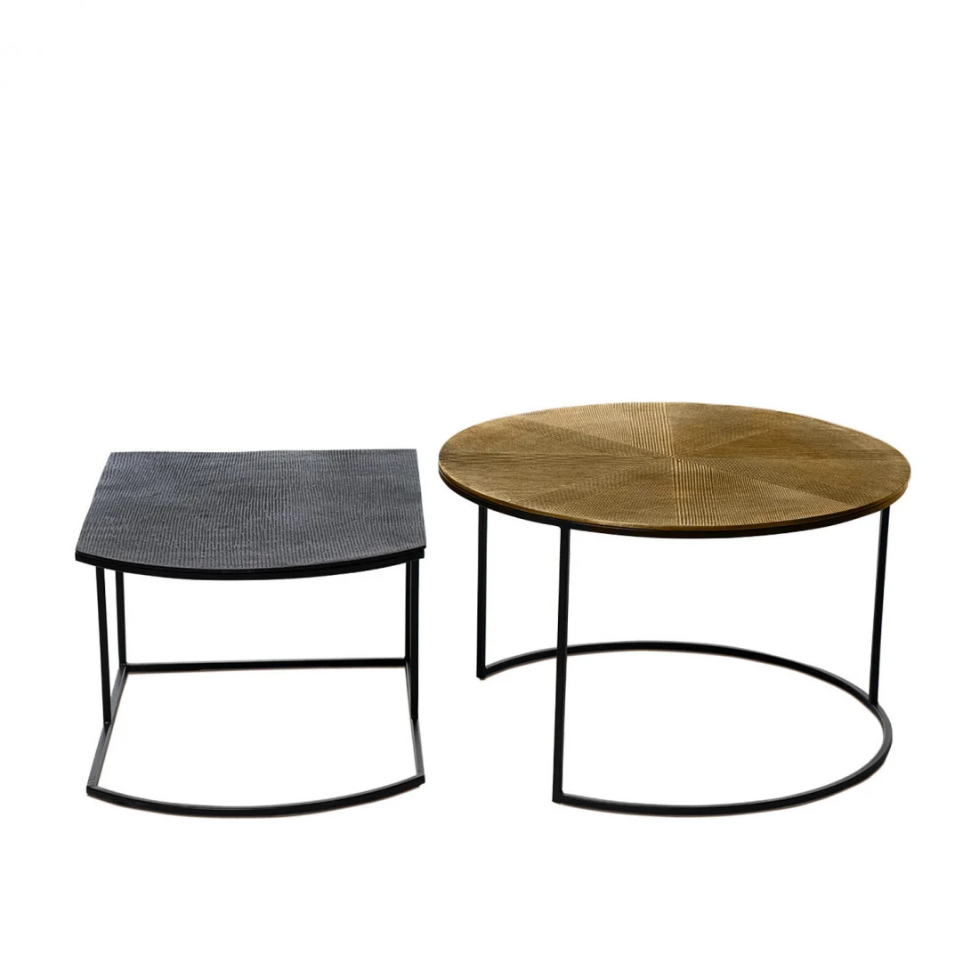 El set de mesas de centro TUSHAR redefine el minimalismo con un toque artístico y un diseño cuidadosamente trabajado. Compuesto por dos mesas en aluminio, sus superficies en tonos dorado y negro crean un contraste sofisticado que aporta elegancia a cualquier ambiente.