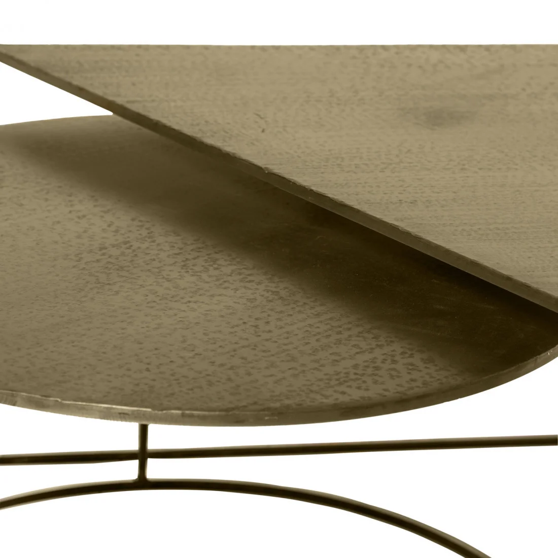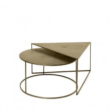 Este conjunto, compuesto por dos mesas de centro , destaca por su diseño sofisticado y materiales de alta calidad. La tapa, elaborada en aluminio, y las patas de hierro presentan un acabado en tono dorado que aporta un toque de distinción y refinamiento a cualquier espacio.