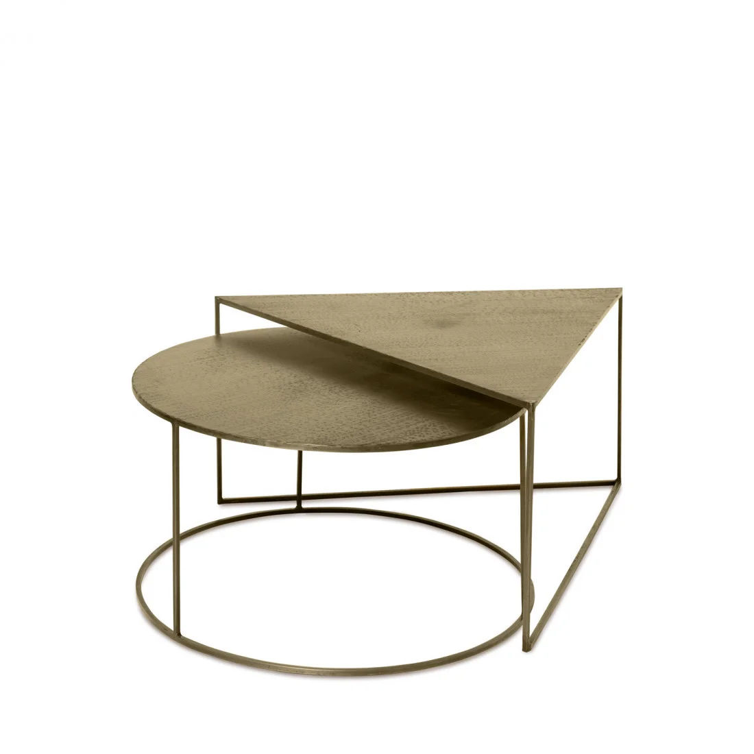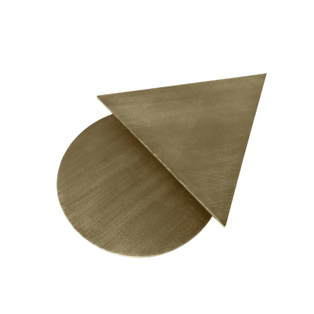 El set combina formas cuidadosamente seleccionadas: una mesa con tapa triangular y otra redondeada, creando un equilibrio visual único y armonioso.
