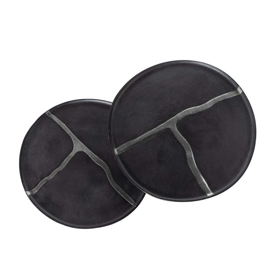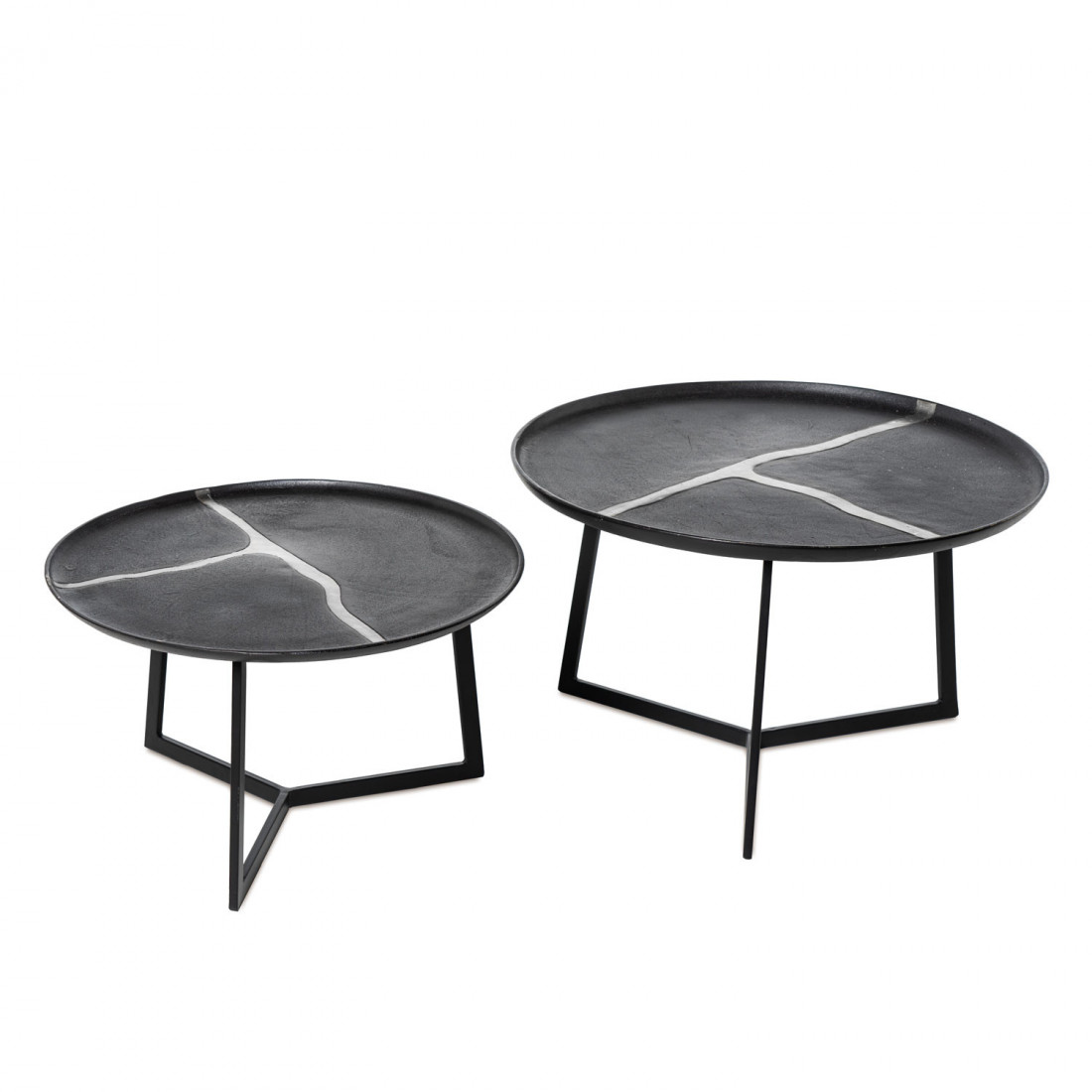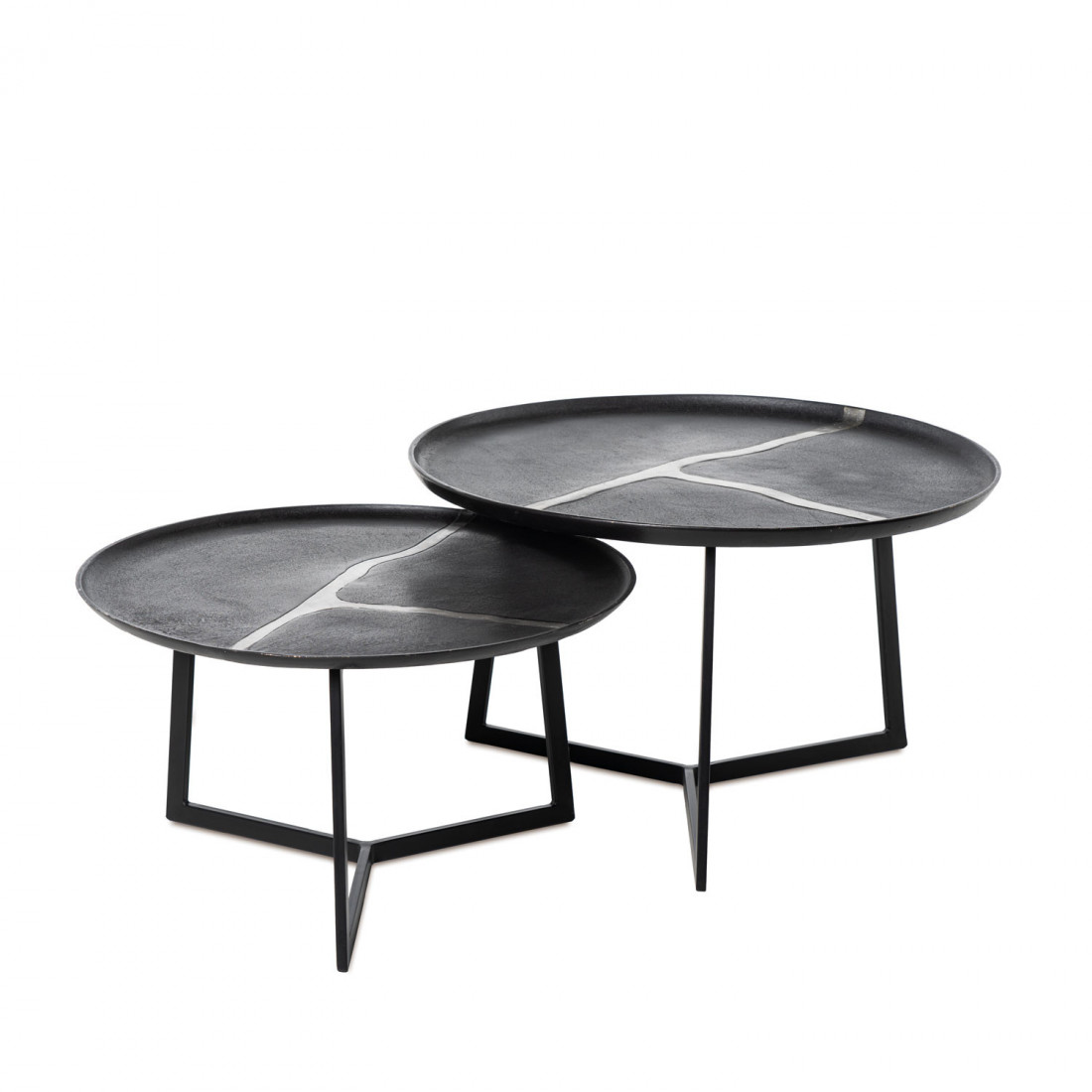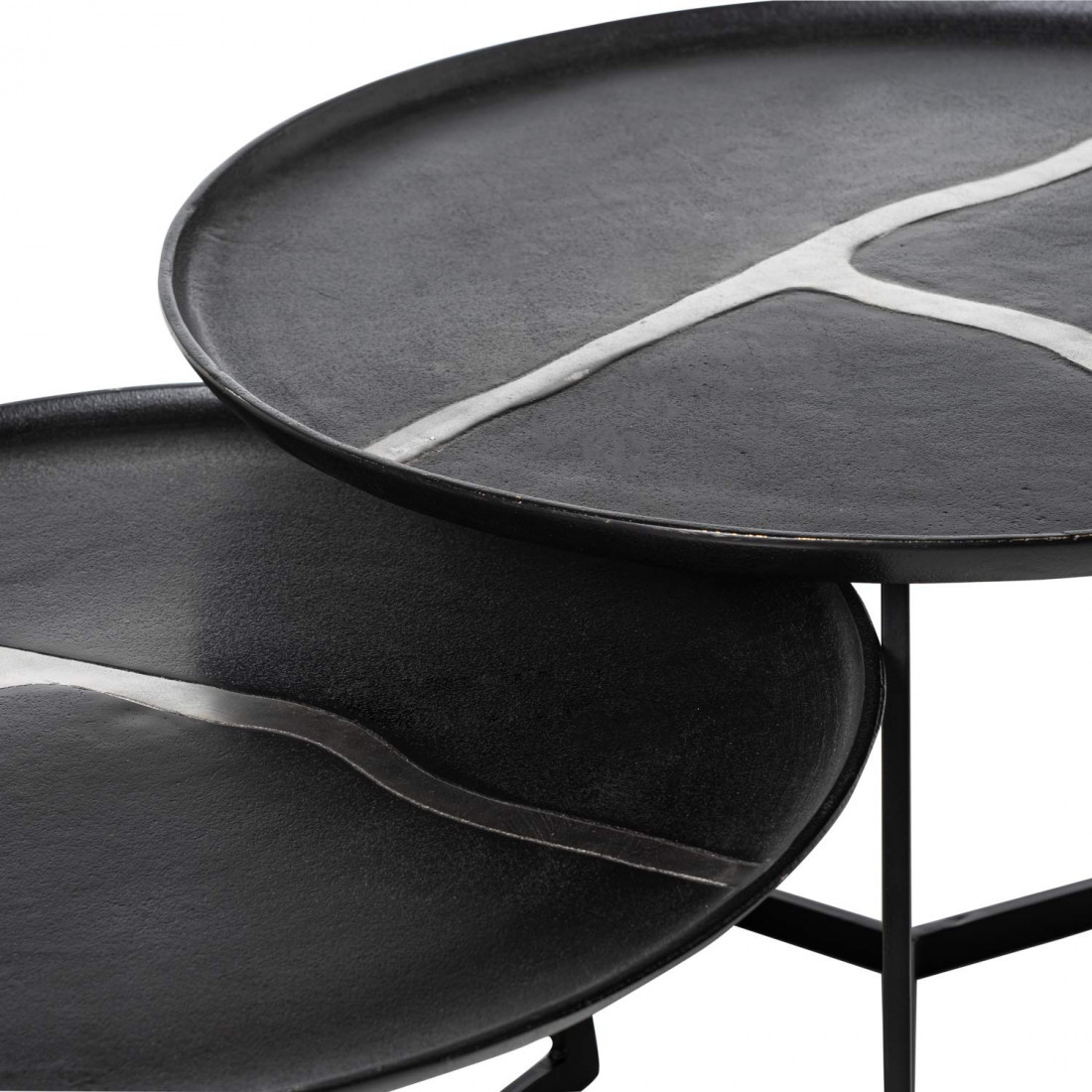Se trata de un conjunto de dos mesas elaboradas en metal de alta calidad con un sofisticado acabado texturizado que imita un diseño marmolado. Las sutiles líneas blancas sobre el fondo negro aportan un aire artístico y refinado, convirtiendo a estas mesas en un elemento decorativo que trasciende su funcionalidad.