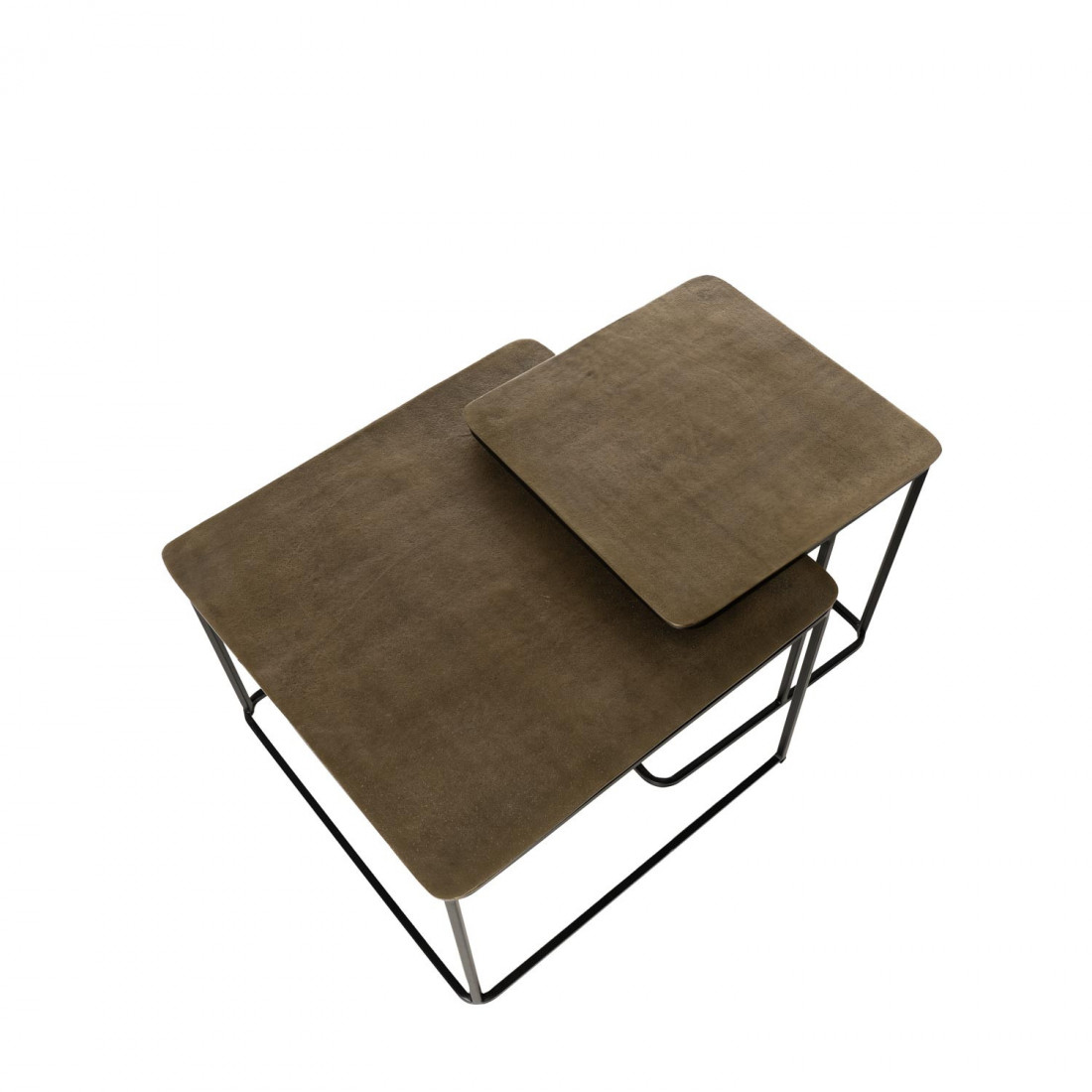 El set de mesas auxiliares PUNJABI fusiona el carácter artesanal con un estilo contemporáneo y sofisticado. Compuesto por dos mesas de distintos tamaños, este conjunto destaca por sus tapas de aluminio en un tono cobre envejecido, que aportan calidez y personalidad al diseño.