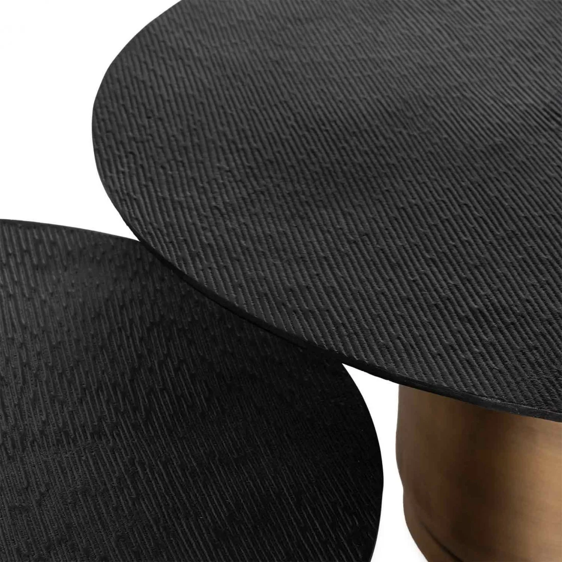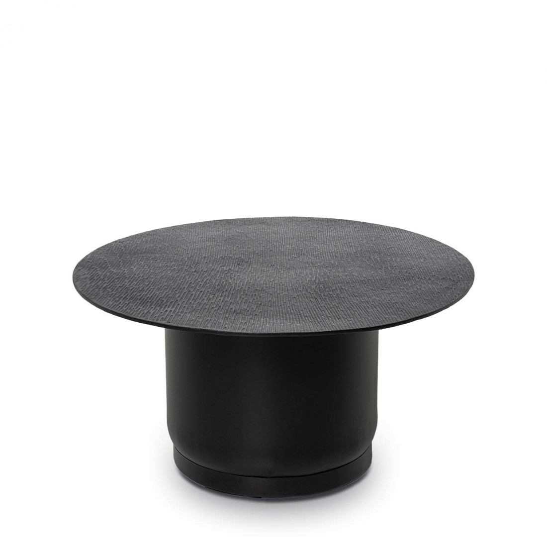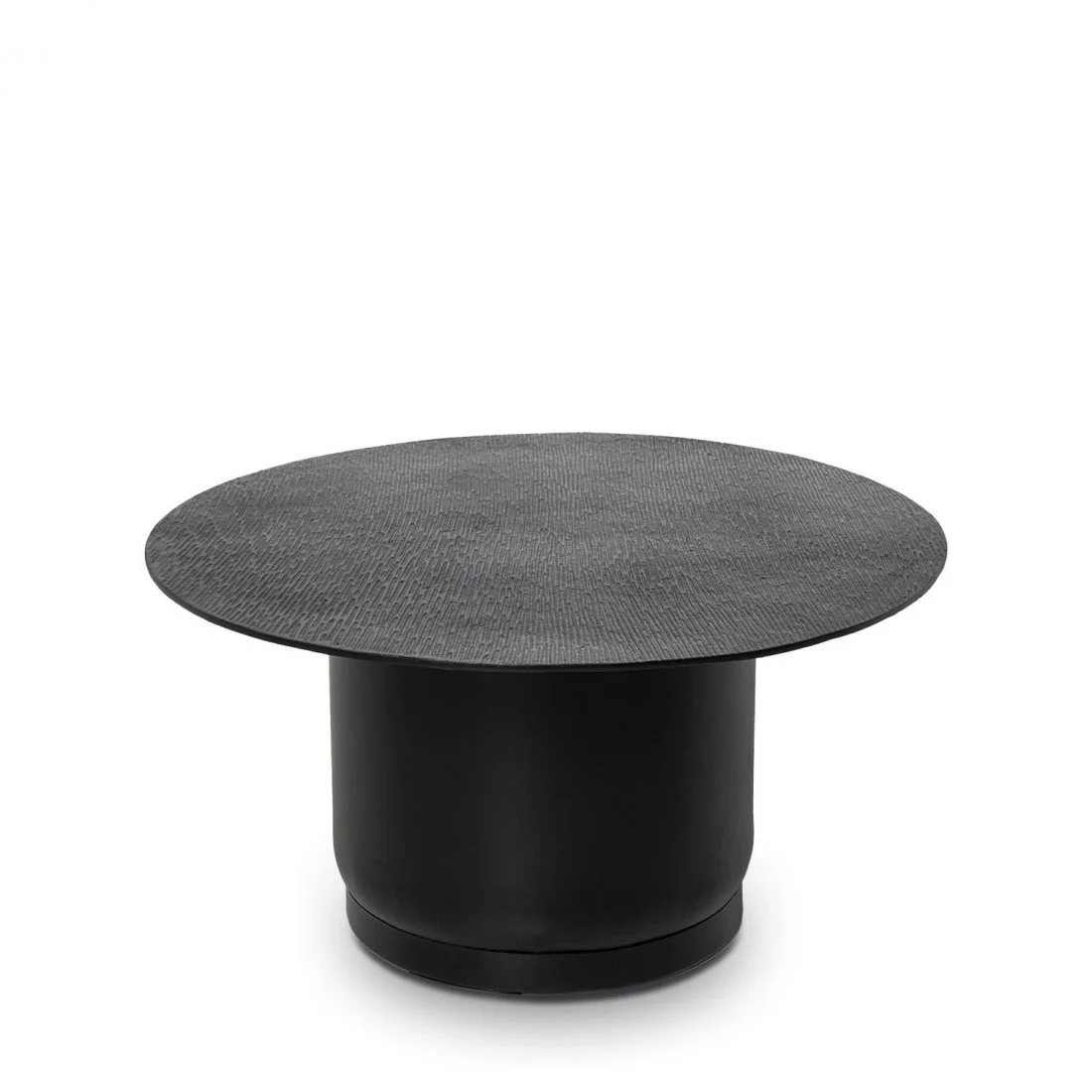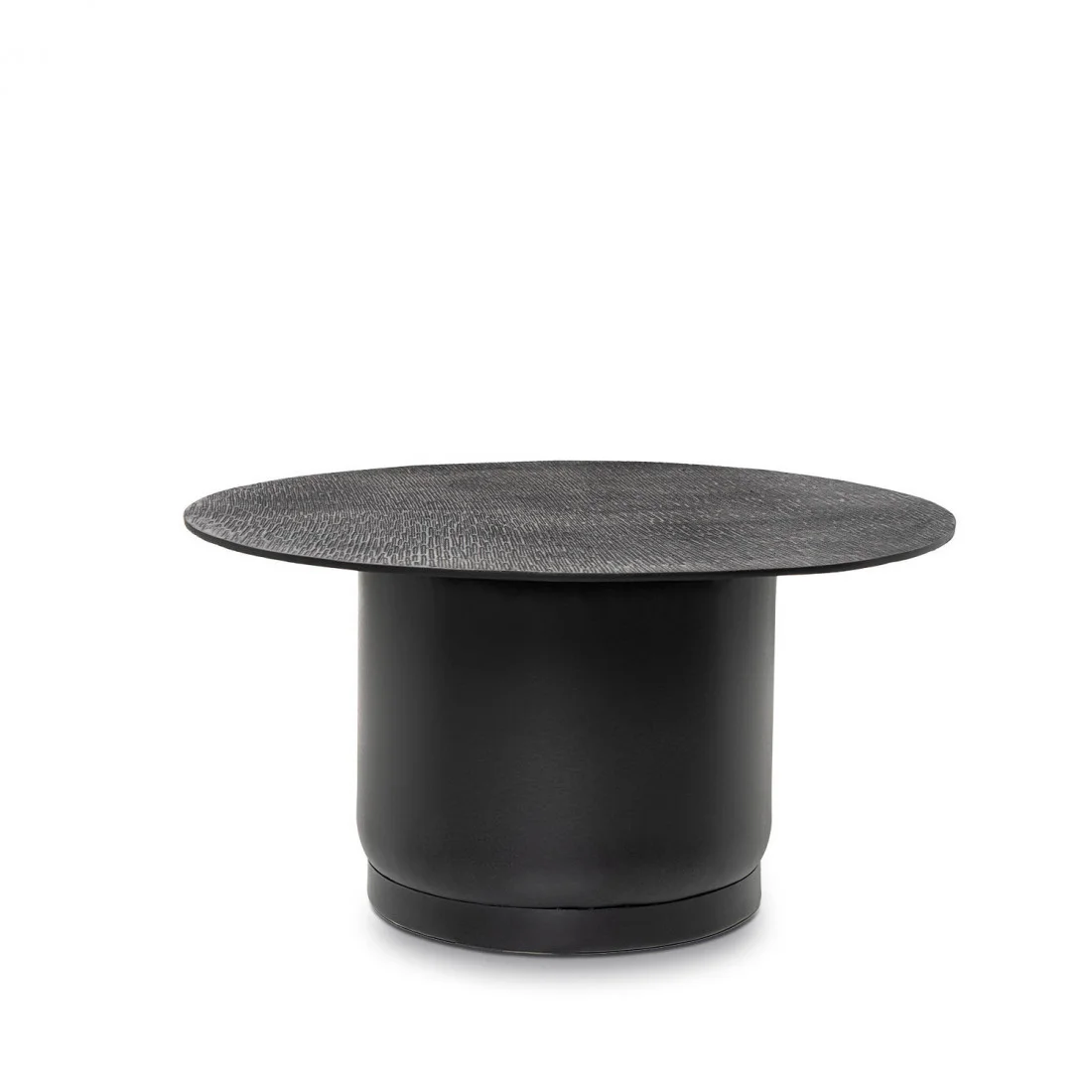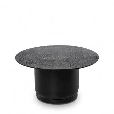La mesa de centro DURAI es una oda al diseño audaz y contemporáneo. Su tapa redonda de aluminio, con un acabado cepillado que aporta textura y sofisticación, refleja la luz de manera sutil, generando un juego visual elegante y moderno.